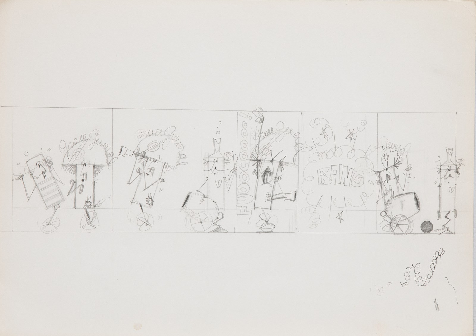 . grafite su cartoncino. Cm 35,00 x 25,00. Il lotto proviene dagli archivi dei collaboratori della Lodolo Film, storica società di spot pubblicitari e di animazione italiana nata verso le fine degli anni 50. I Posteros, personaggi di fantasia, primitivi del futuro, nascono dalla collaborazione di Pino Pascali con la Lodolo film nel1958, un anno prima del suo diploma all’Accademia di Belle Arti di Roma; sodalizio che durò sino al 1967. Sandro Lodolo, titolare della casa di produzione pubblicitaria, e Pino Pascali, nel ruolo di creativo, realizzarono innumerevoli spot e cartoons pubblicitari. Gli Intermezzi che videro proprio i Posteros come protagonisti furono eseguiti , sia in bianco e nero che a colori, nel 1962 e nel 1968, anno della morte di Pascali, quando vennero ripresi da Lodolo come studio per i personaggi di un nuovo contenitore pubblicitario del secondo programma della Rai.
