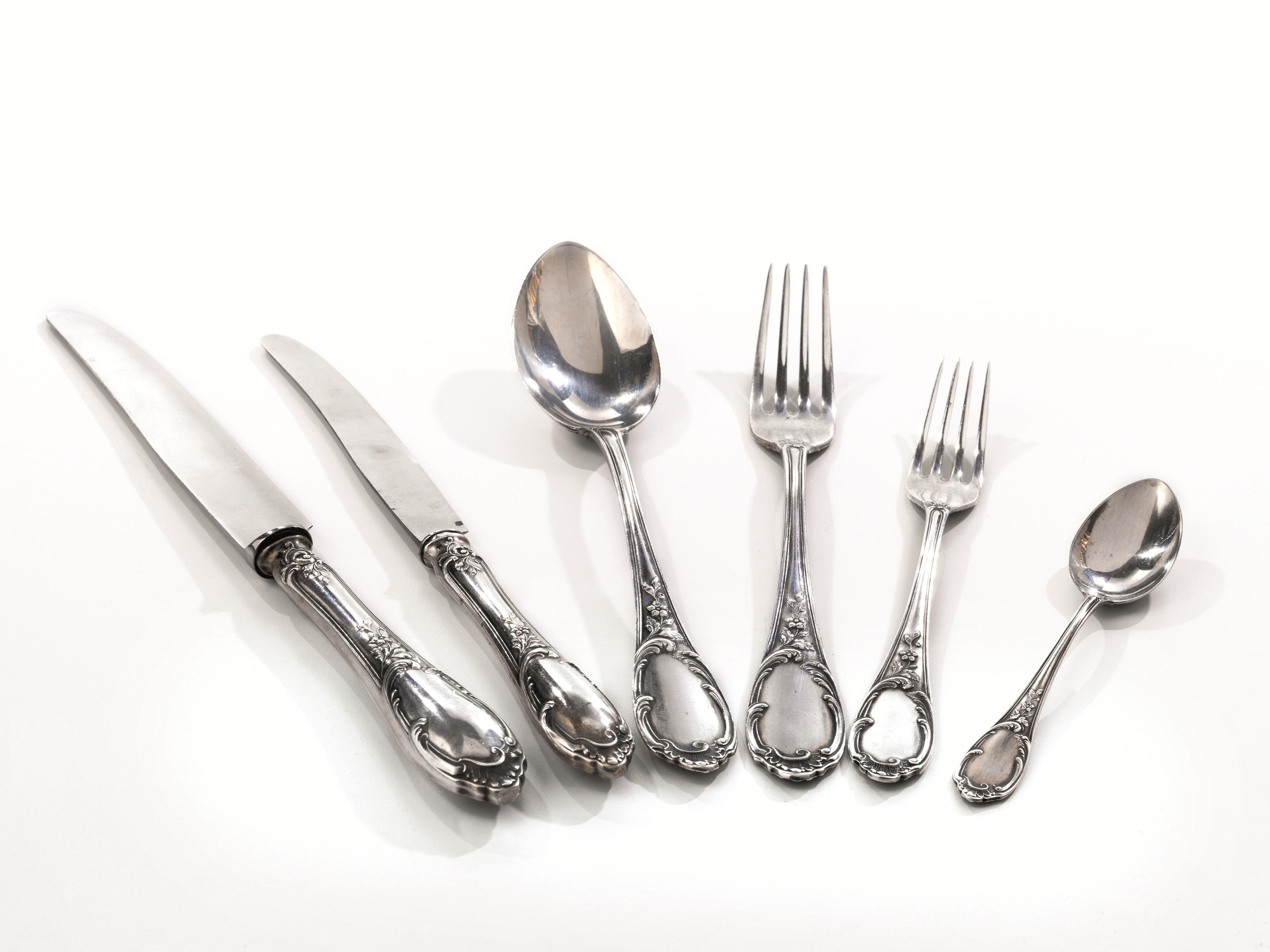 Servito di posate, in argento, manici cesellati a volute di foglie, composto...