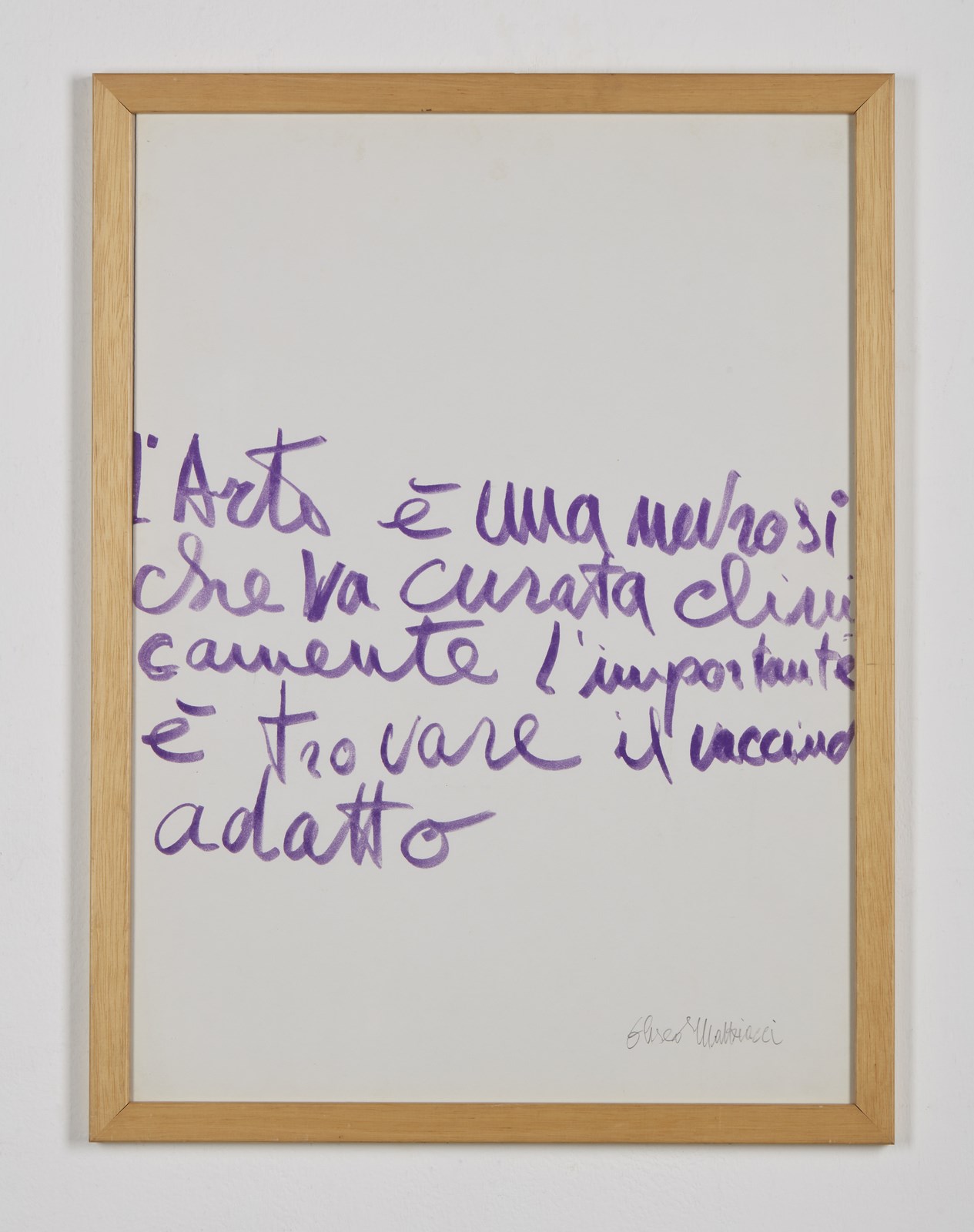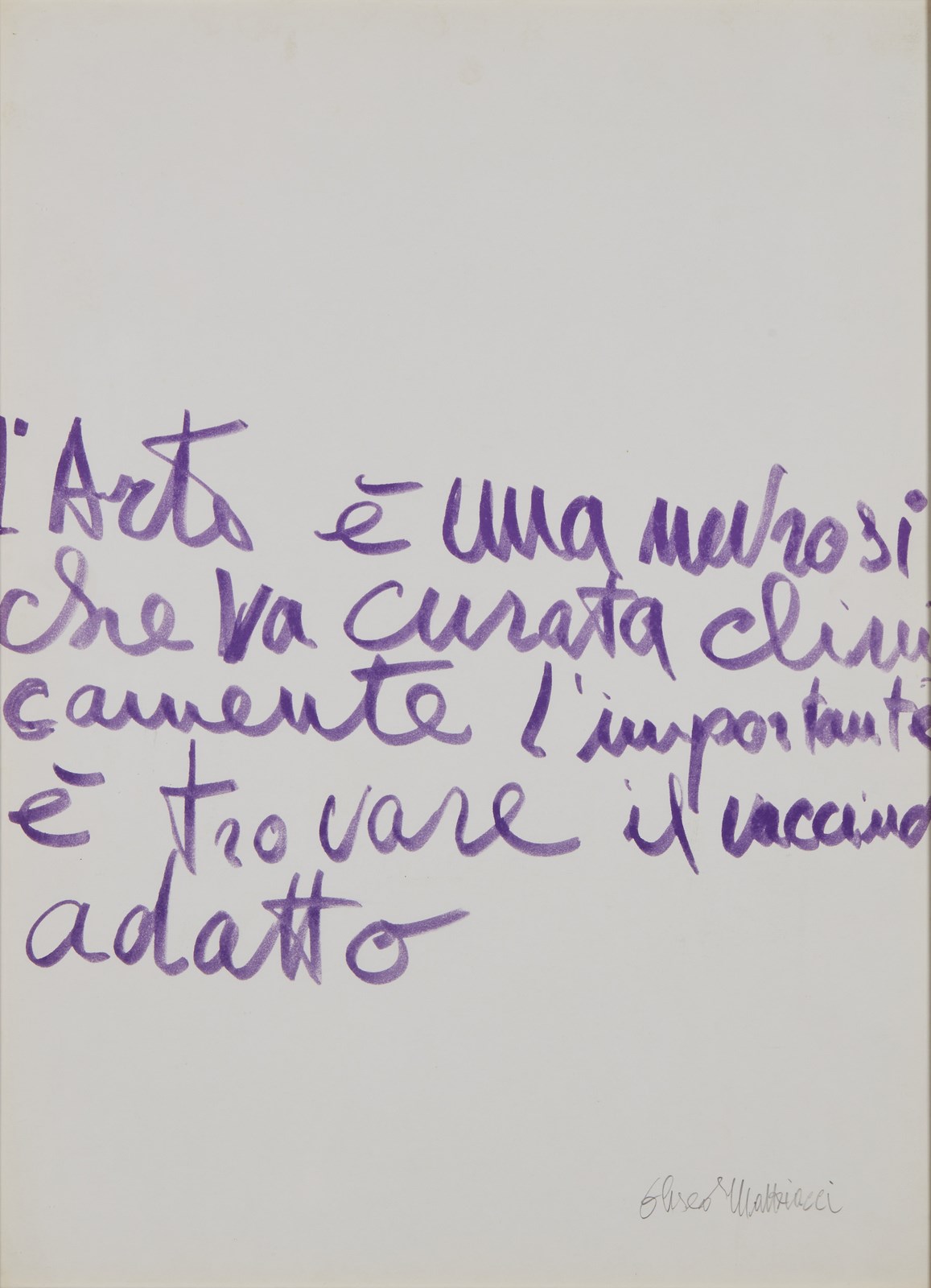MATTIACCI ELISEO (n. 1940) L'arte è una nevrosi. 1974. Pennarello su carta. Cm 40,00 x 53,00. Firma in basso a destra. Provenienza: Galleria Pio Monti, Roma; Collezione privata, Roma. Cornice presente