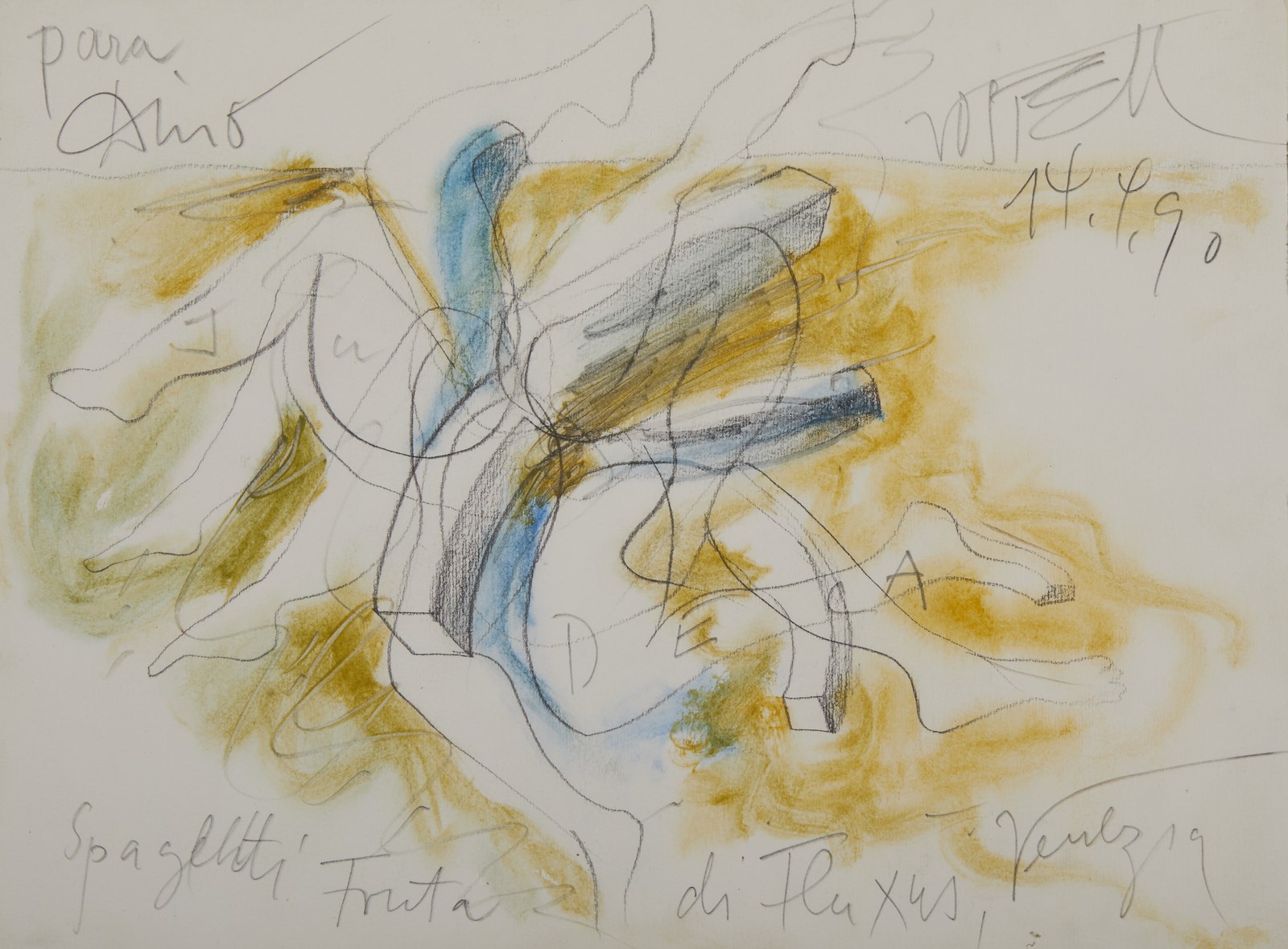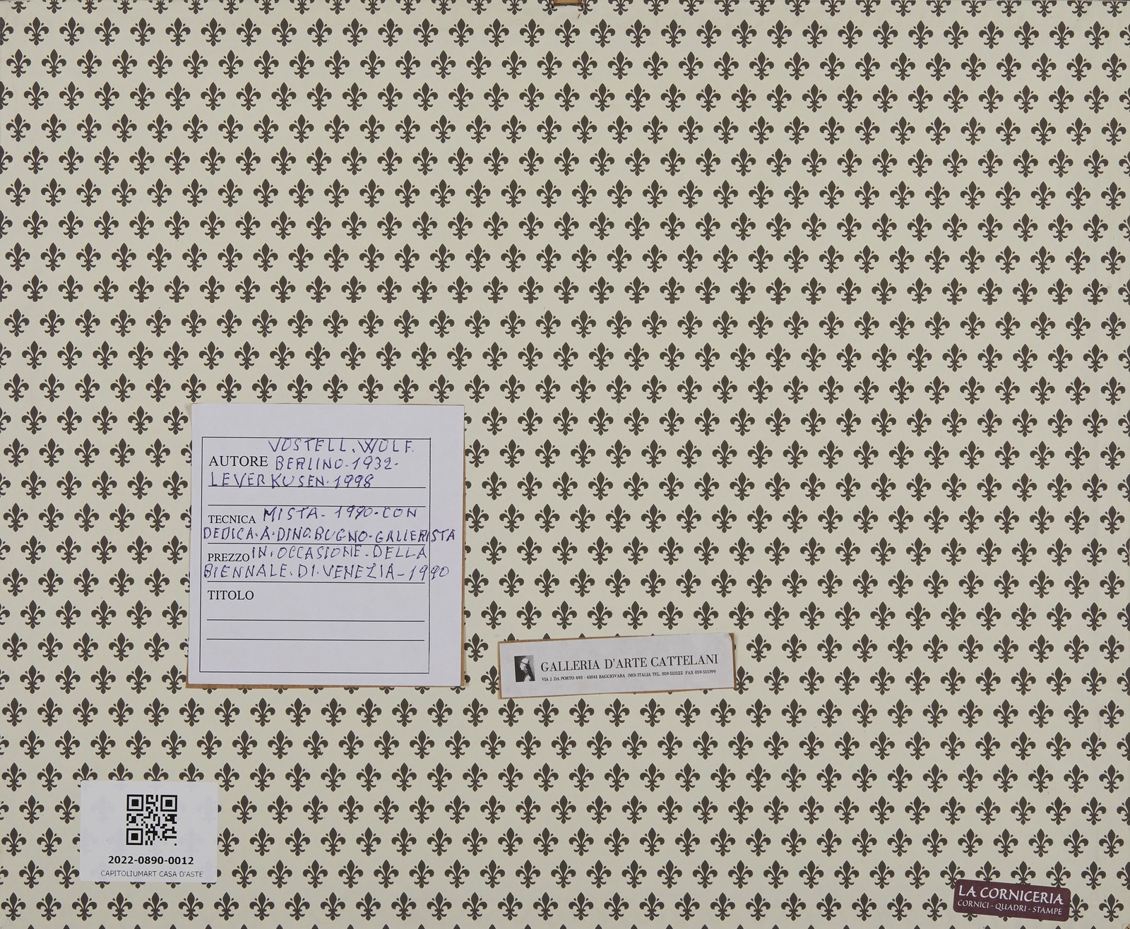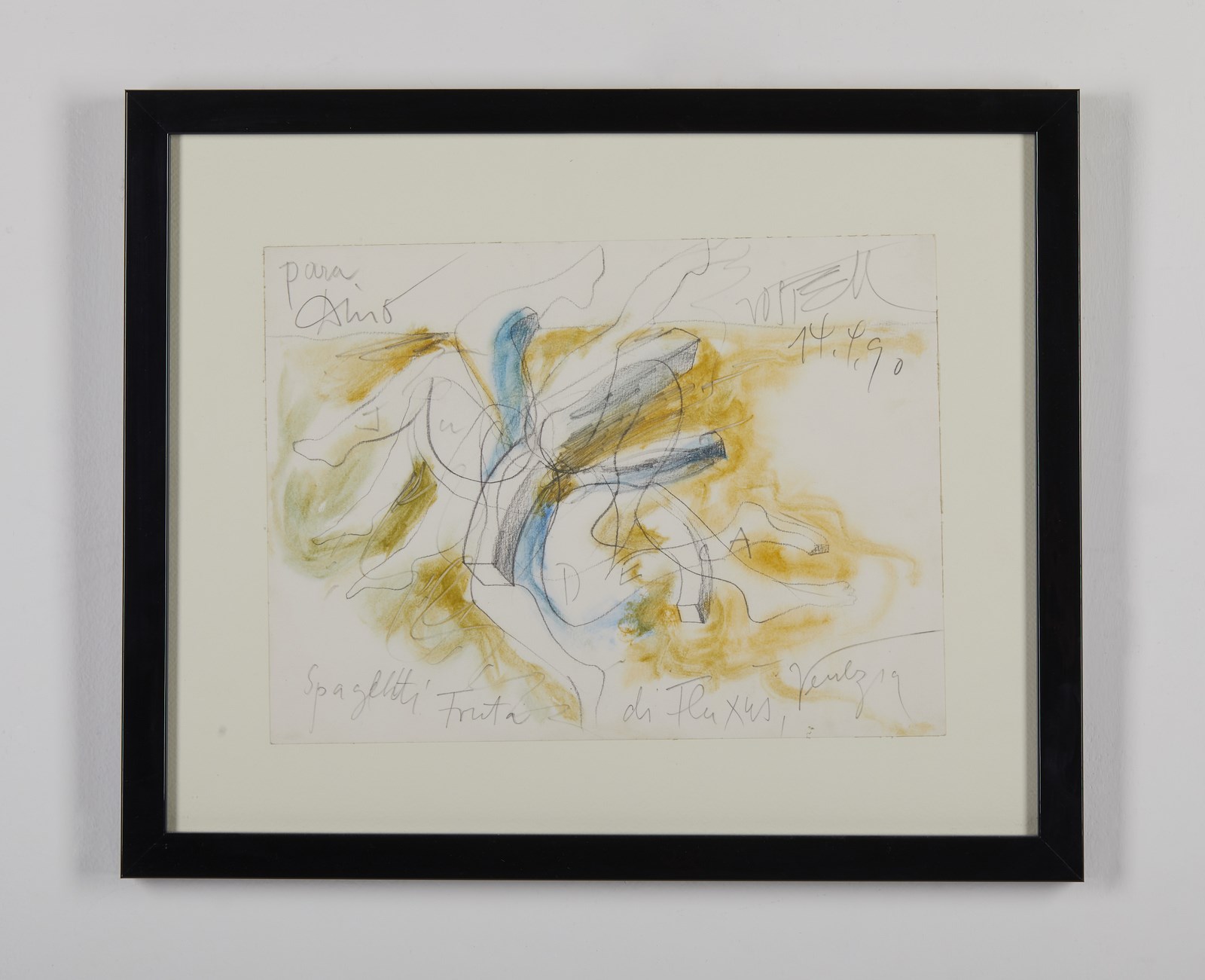 VOSTELL WOLF (1932 - 1998) Spaghetti, frutta di fluxus, Venezia. 1990. Tecnica mista su carta. Cm 30,50 x 22,50. Firma e anno in alto a destra. Titolo in basso al centro. Dedica a Dino Bugno in alto a sinistra. Autentica su fotografia Galleria d'arte Cattelani, Baggiovara. Provenienza: Galleria d'arte Cattelani; Collezioni privata, Rimini. Cornice presente