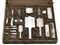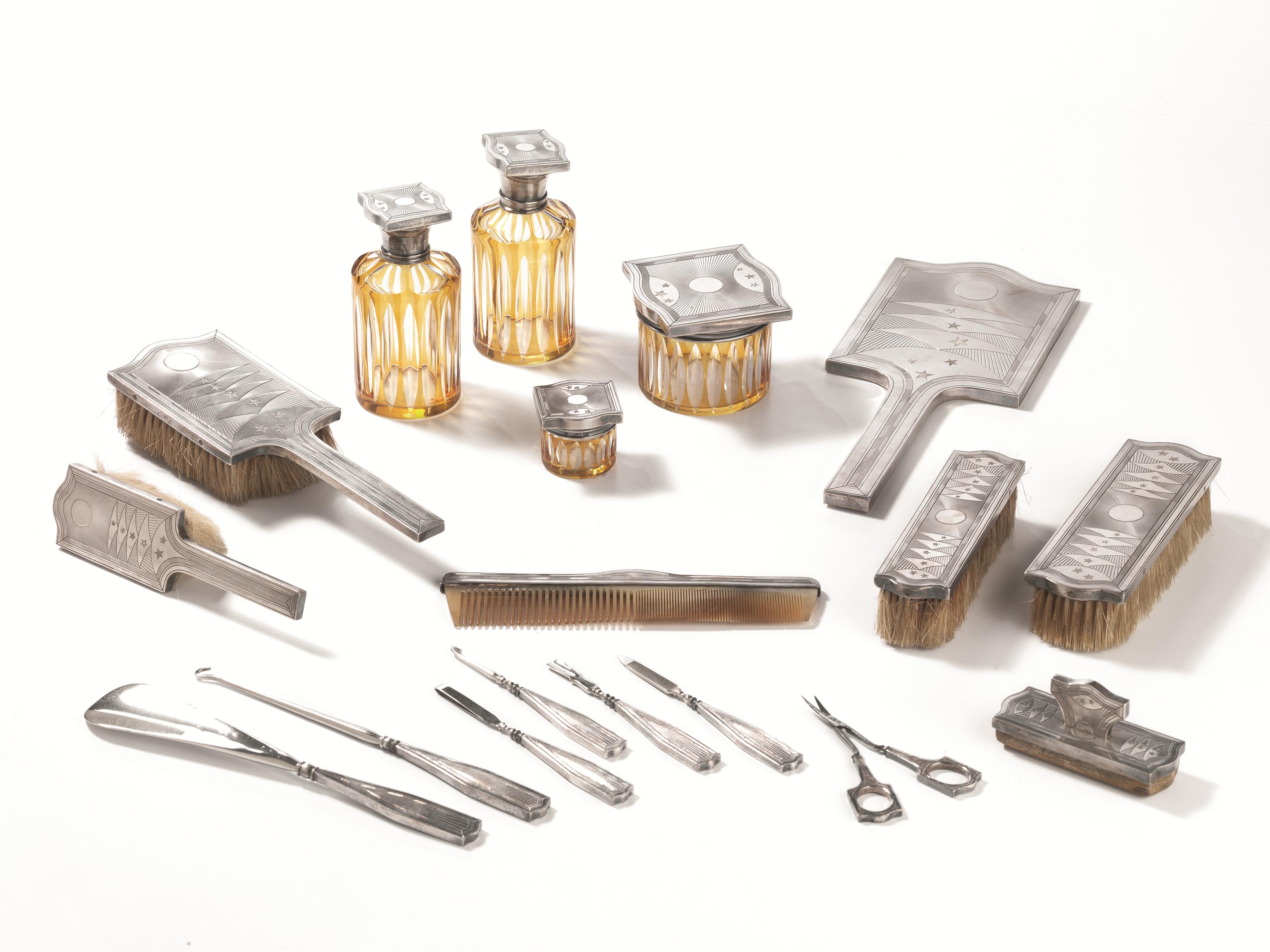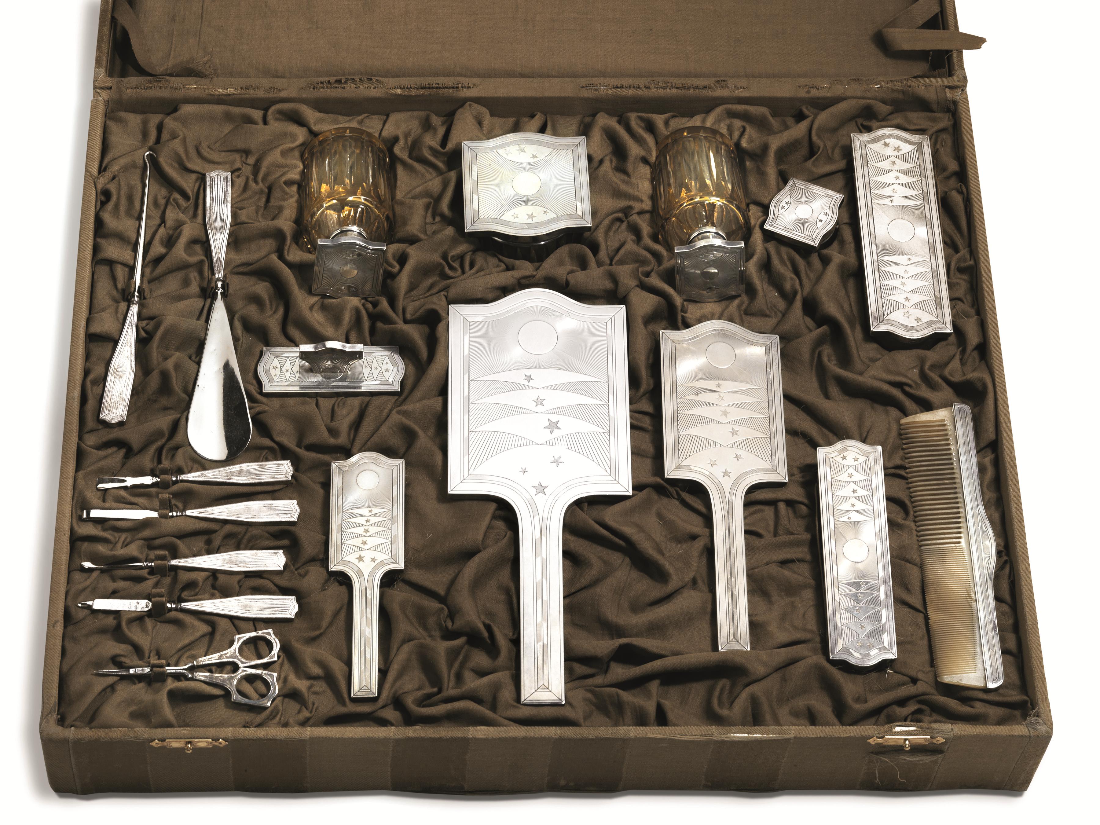 Servito da toilette disegnato da Ernesto Thayaht, 1930, in argento inciso con motivi di gusto déco, composto di diciotto pezzi, completo di scatola originale decorata sul fronte esterno con uno stemma nobiliare da cui si dipartono racemi (18)