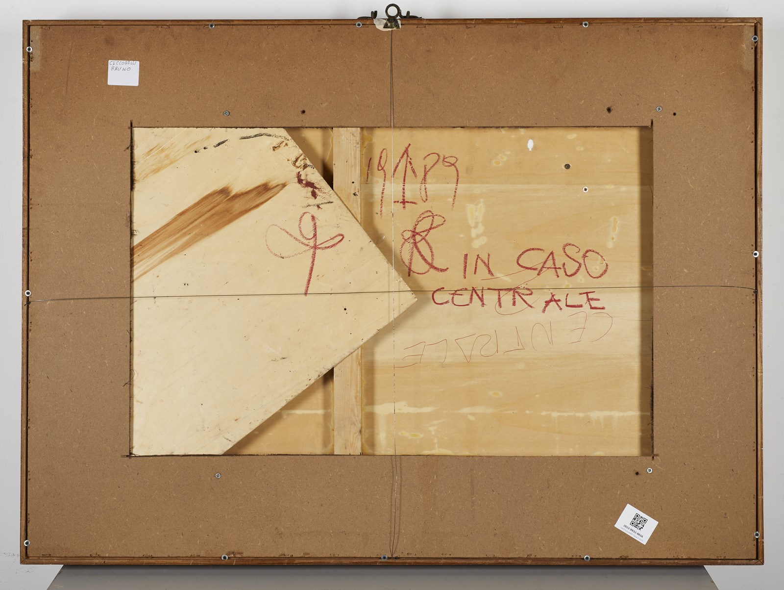 CECCOBELLI BRUNO (n. 1952) Il caso centrale. 1989. Tecnica mista su tavola. Cm 87,00 x 59,00. Al retro titolo, firma e anno. Autentica dell'artista su fotografia. Cornice presente