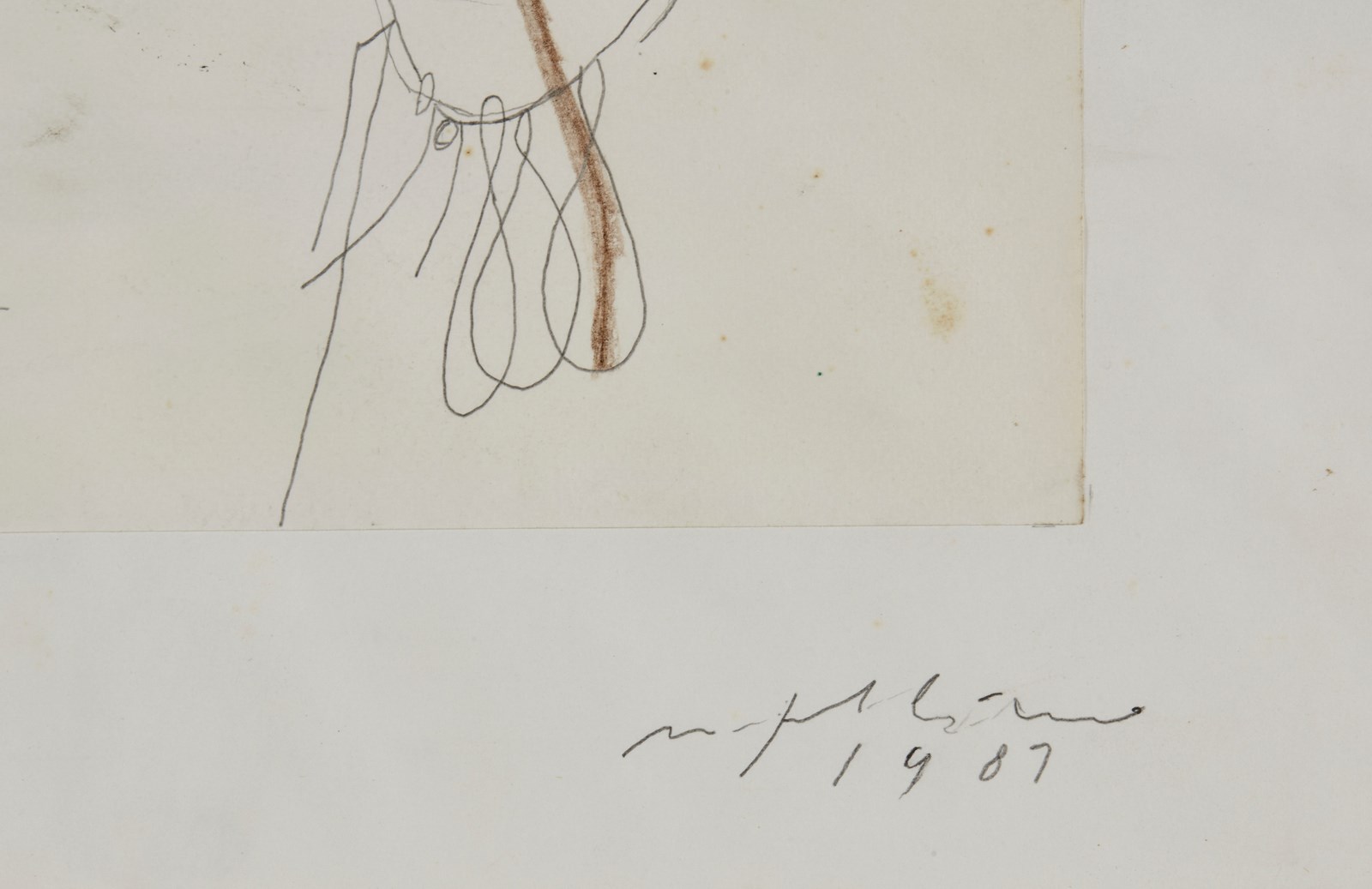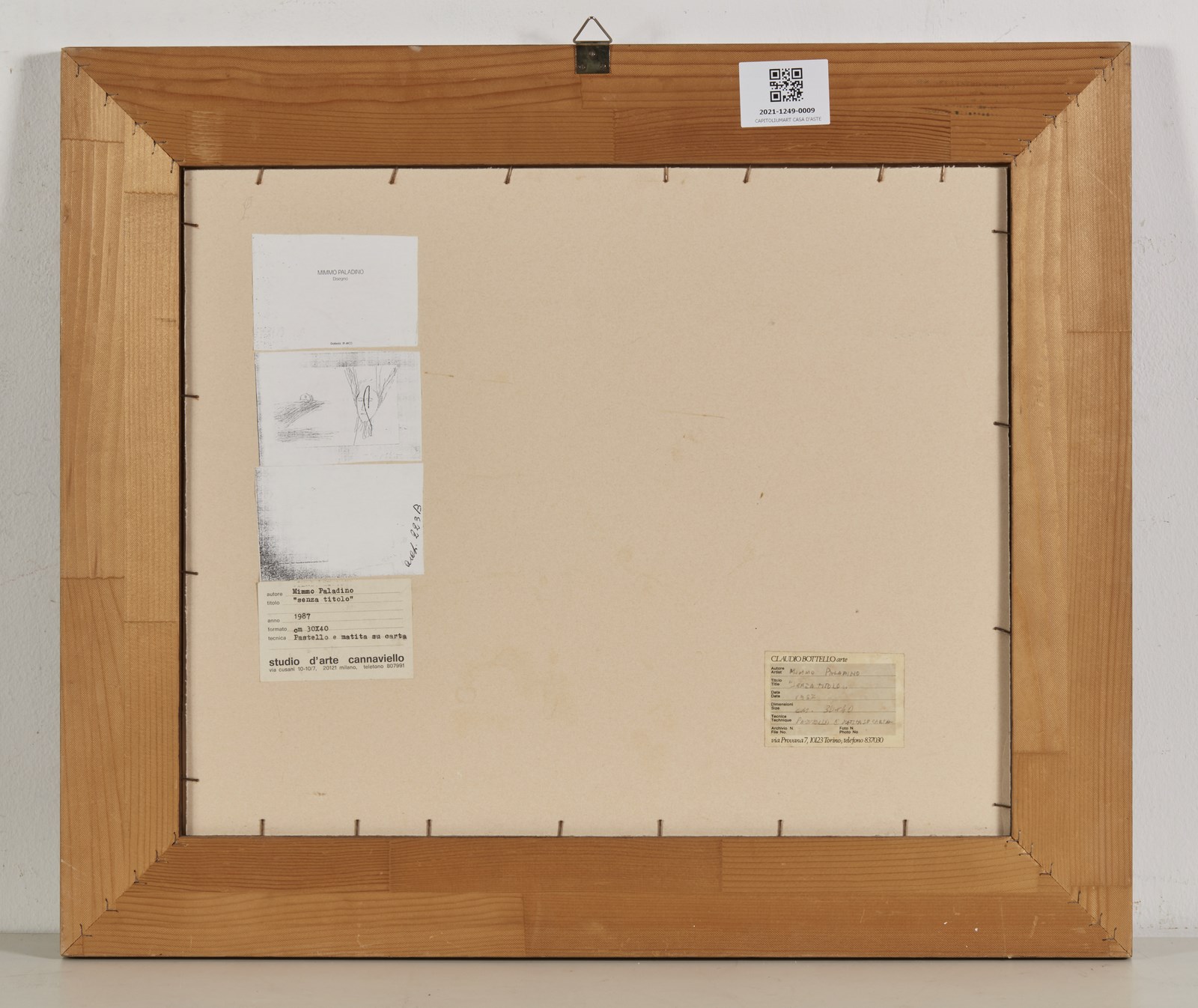 PALADINO MIMMO (n. 1948) Senza titolo. 1987. Tecnica mista su carta. Cm 40,00 x 30,00. Firma e anno in basso a destra. Al retro cartiglio descrittivo Studio D'arte Cannaviello, Milano e Claudio Bottello Arte, Torino. Autentica dell'artista su fotografia riportante il relativo numero d'inventario. Lievi difetti. . Cornice presente