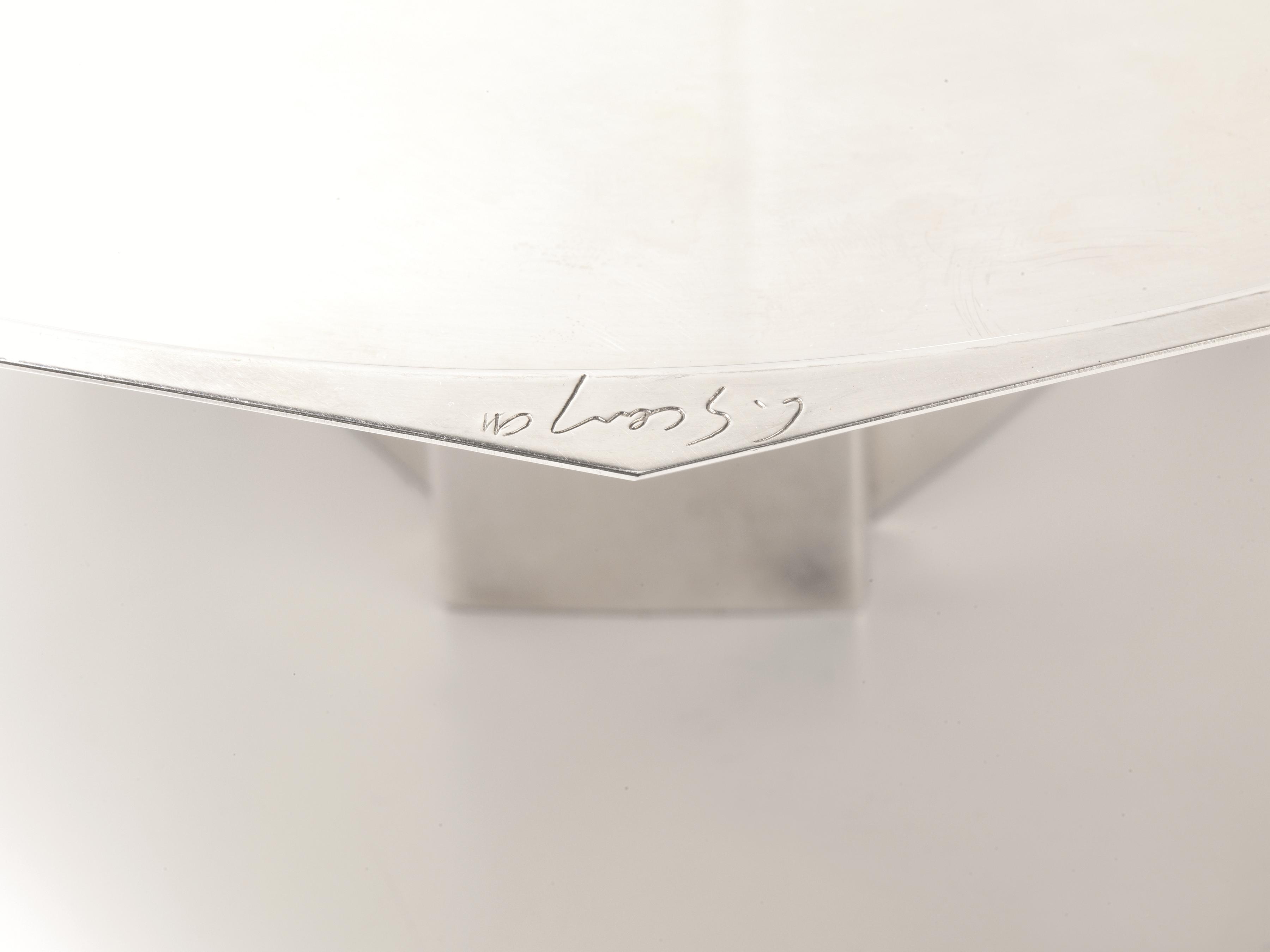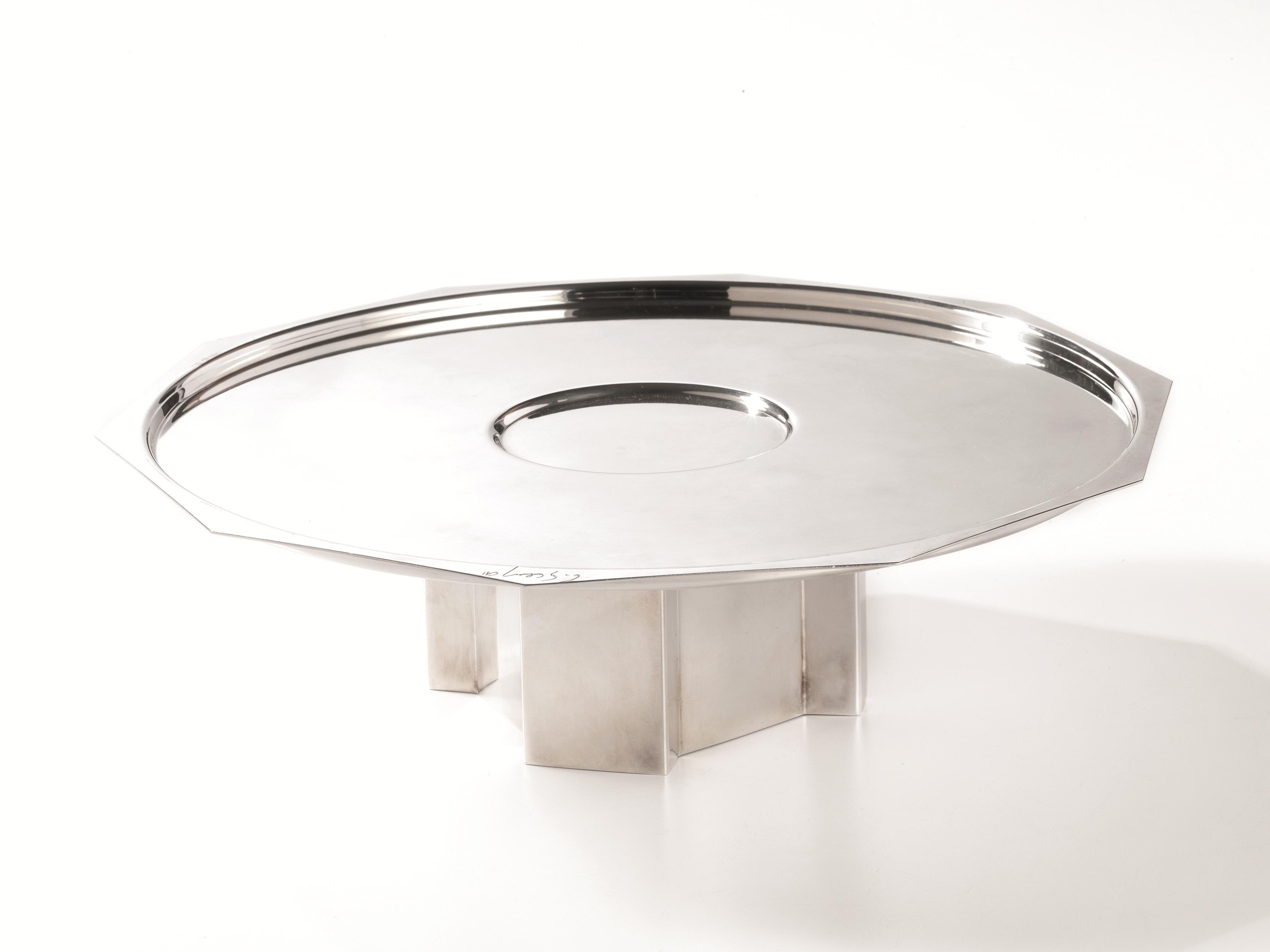 Alzata, in argento, di forma circolare con bordo sfaccettato, reca la firma C. Scarpa e la dedica "Scarpa per Cleto Munari", diam. cm 30, alt. cm 8, g 1048