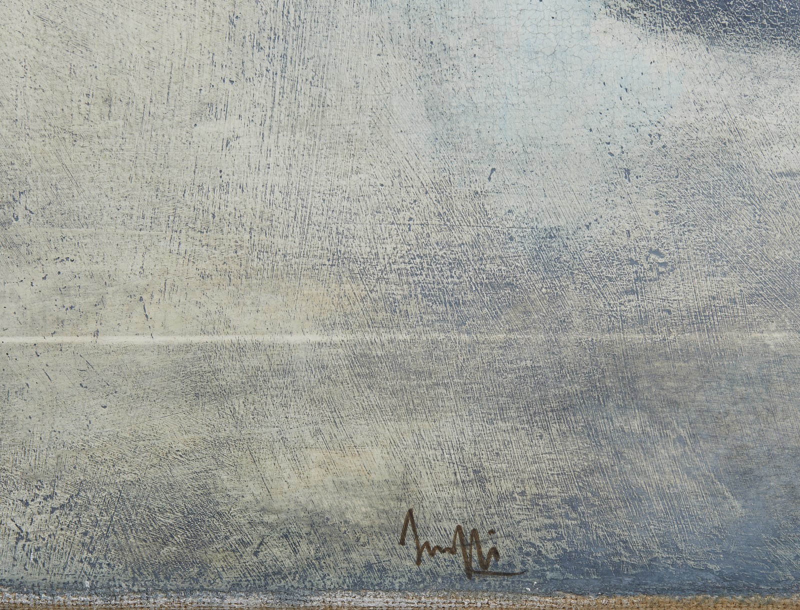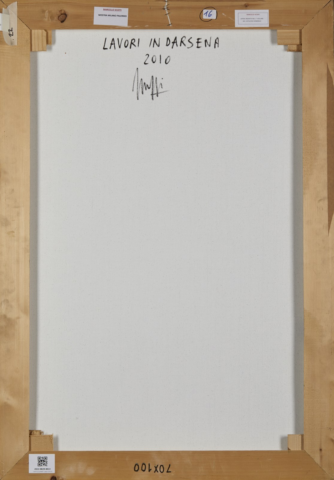 SCUFFI MARCELLO (n. 1948) Lavori in darsena. . 2010. Olio su carta intelata. . Cm 70,00 x 100,00. Firma in basso al centro. Al retro titolo, firma e anno. Autentica dell'artista su fotografia. . Cornice presente