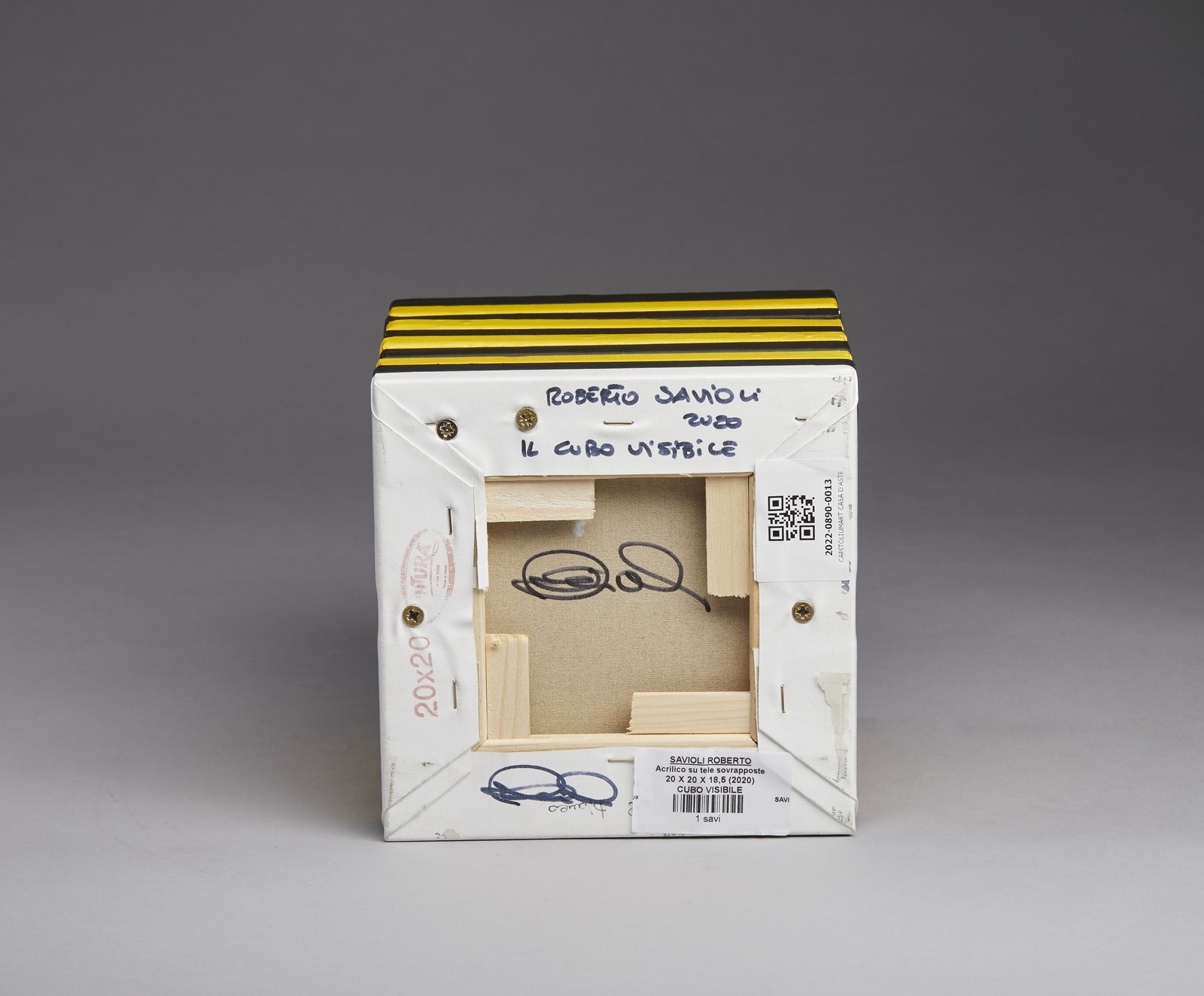 SAVIOLI ROBERTO (n. 1962) Il cubo visibile. 2020. Tecnica mista e assemblaggio. Cm 20,00 x 20,00 x 18,50. Titolo, firma e anno sotto la base. Autentica dell'artista su fotografia.