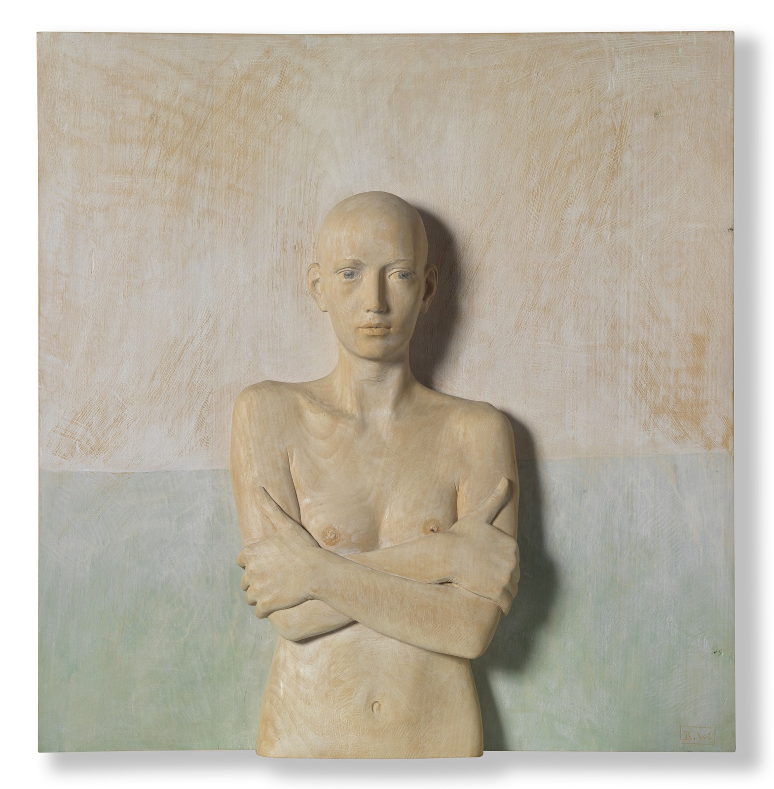 WALPOTH BRUNO (n. 1959) Alice. Legno di tiglio.. Cm 65,00 x 65,00. Firma monogrammata incisa in basso a destra. Al retro titolo e timbro dell'artista. Certificato a cura della Camera di Commercio di Bolzano riportante il relativo numero d'inventario. Esposizione: Bruno Walpoth - Il realismo magico dell'arte plastica a cura di Letizia Ragaglia, Maggio 2006, Galleria Gnaccarini, Bologna.