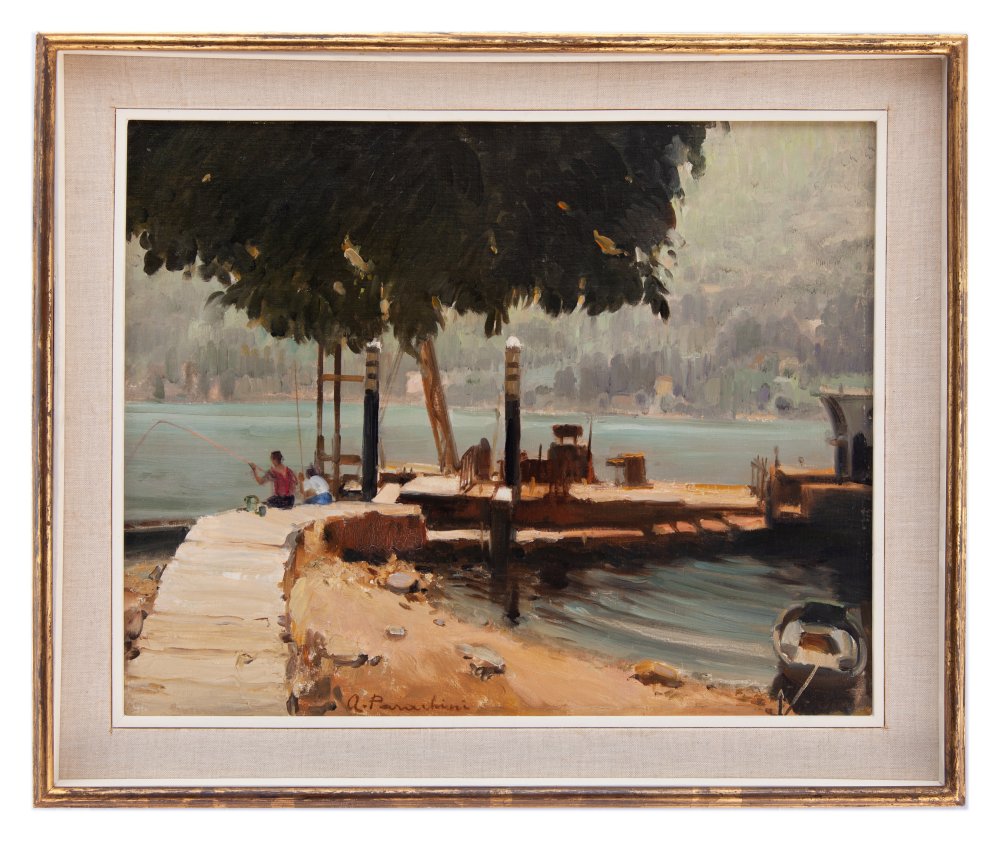 Achille Parachini Torino 1888-1970 Giornata di pesca, lago Maggiore Olio su tela cm 40x50