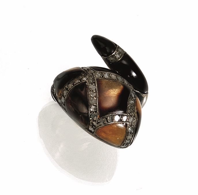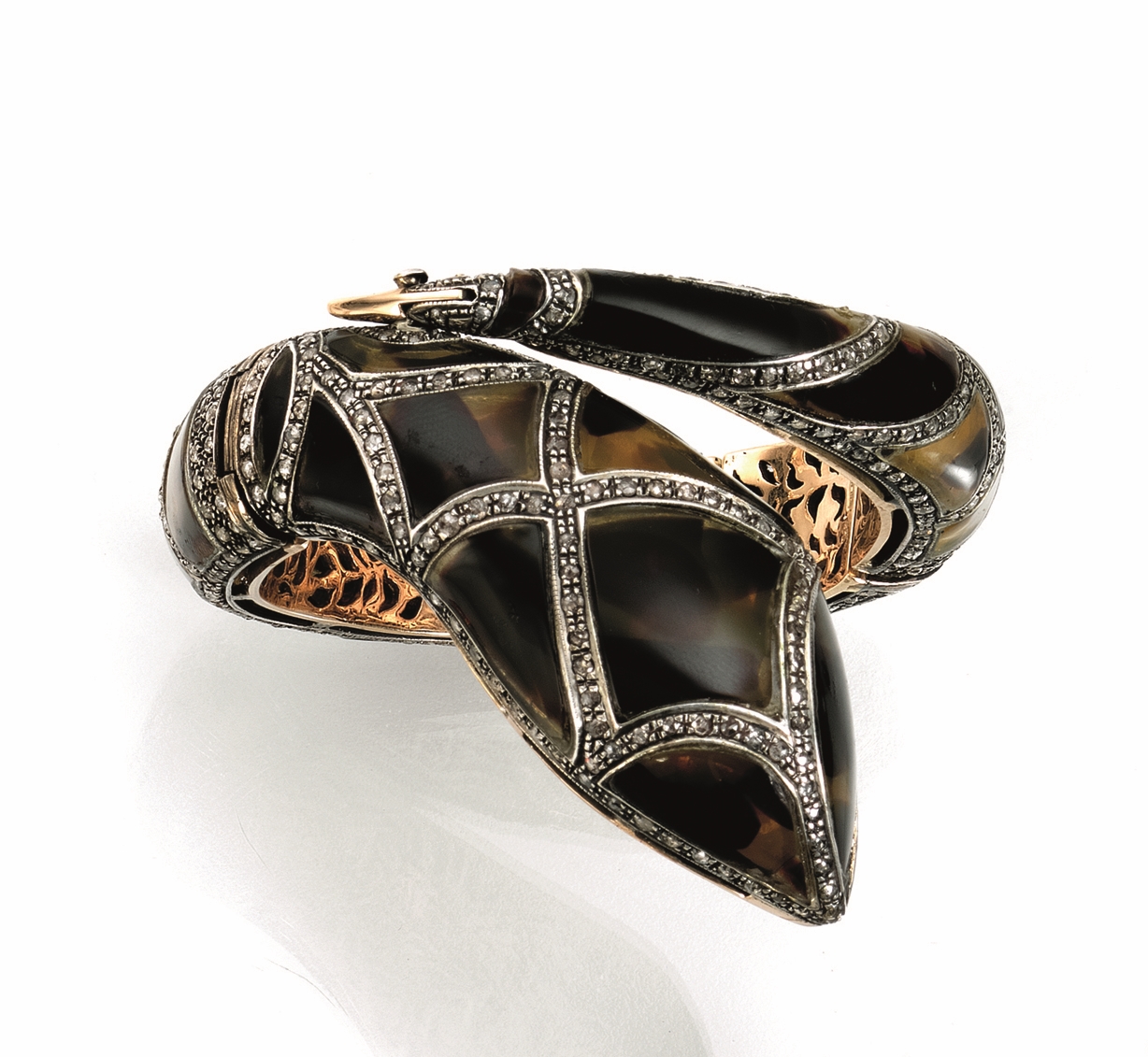 ciascuno modellato come un serpente avvolto su se stesso incastonato con piccoli brillanti, montatura interna del bracciale traforata con la scena del peccato originale, punzoni 585 e 925, g 91 e g 16 (2)