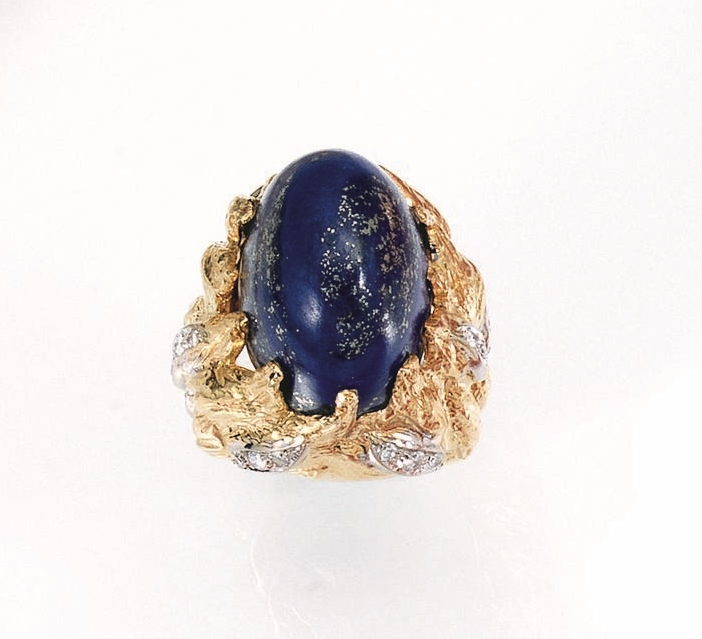 realizzato come una fascia bombata sbalzata e cesellata a motivi fogliacei in oro giallo e oro bianco con inserti in brillanti al centro della quale è montato un lapislazzuli ovale cabochon, g 25