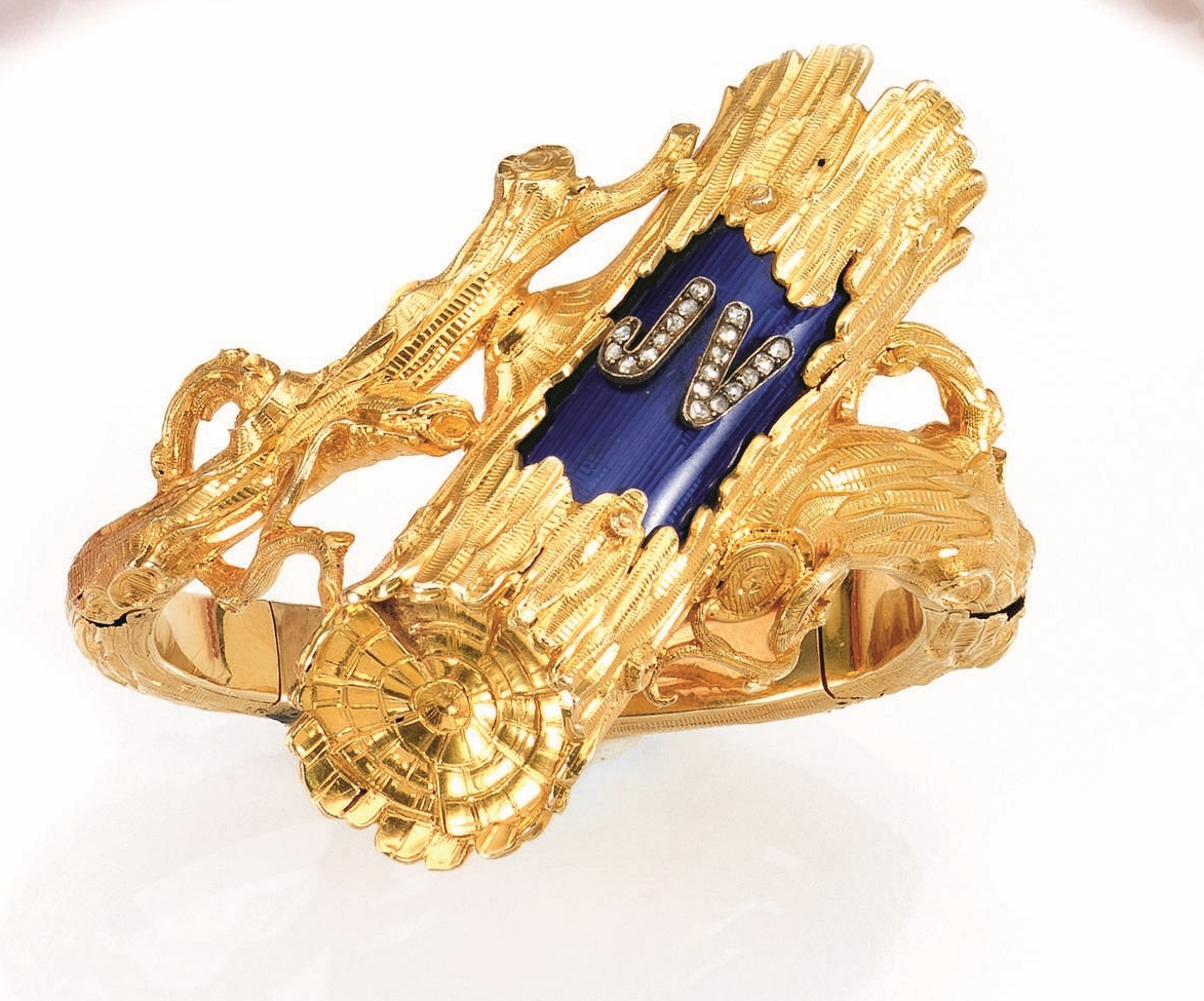 a cerchio semi-rigido realisticamente modellato come il ramo di un albero, al centro una sezione di tronco in oro cesellato con finta cavità decorata in smalto blu ed iniziali in rose di diamante, all'interno scomparto segreto, g 60