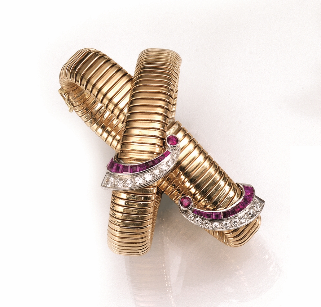 Coppia di bracciali, Inghilterra, anni '40, in oro giallo 9 kt, oro bianco, diamanti e rubini sintetici