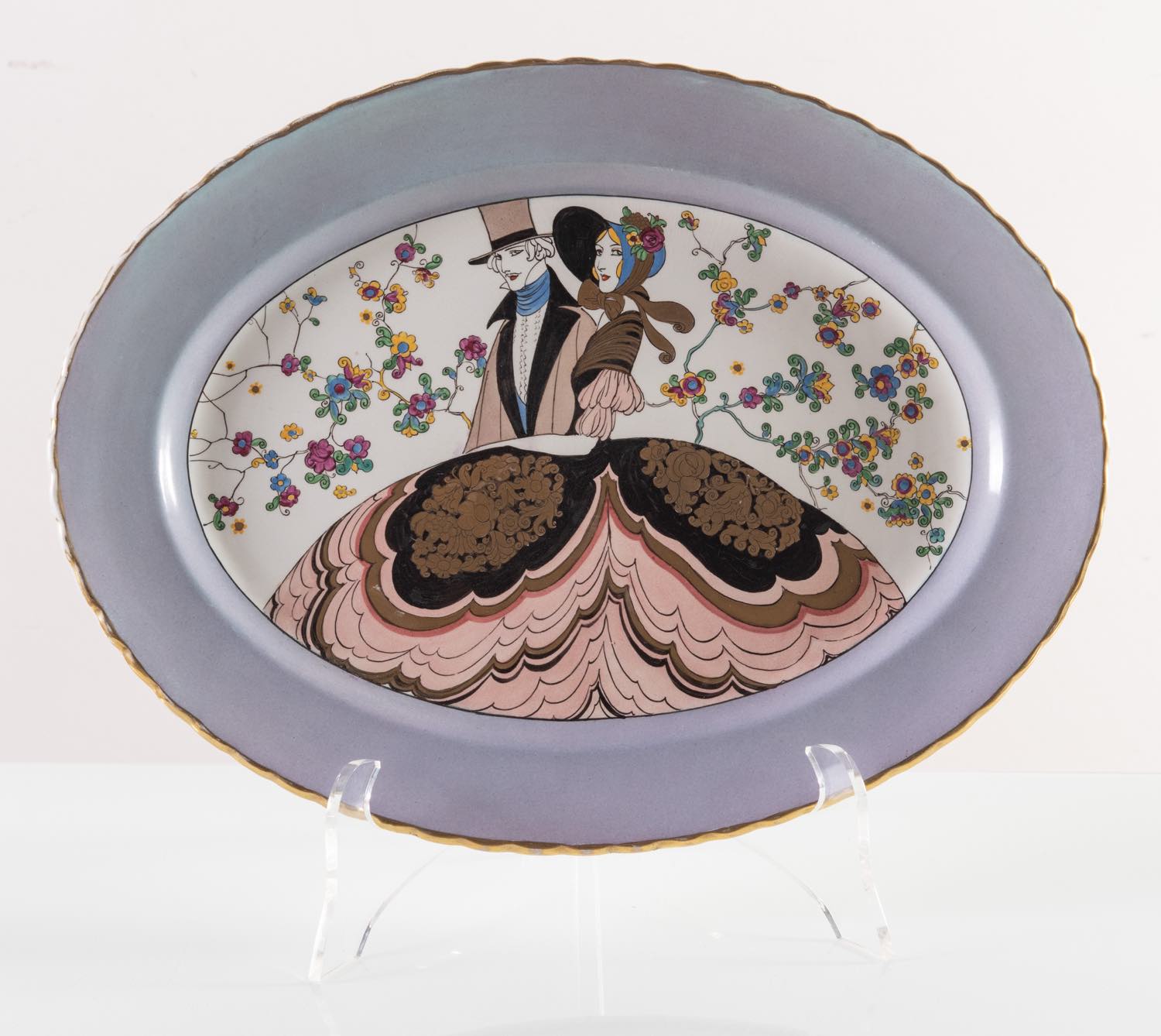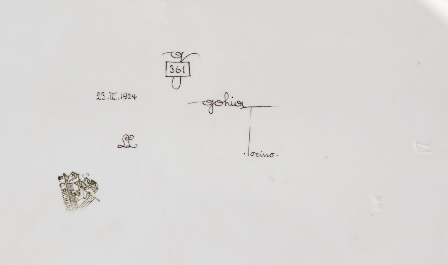 Composto da: Piatto ovale dipinto in policromia con cavetto decorato e bordo dorato, reca al retro marchio S. C. Richard e iscrizione “g/361/23.III.1924 golia/LL Torino”, H cm 4x34.5x45 (usure alla doratura); Piatto tondo dipinto in policromia con cavetto decorato, reca al retro iscrizione “728 golia/Torino 3.VIII.1925”, H cm 2 – diametro cm 28.5 (restauri)
