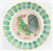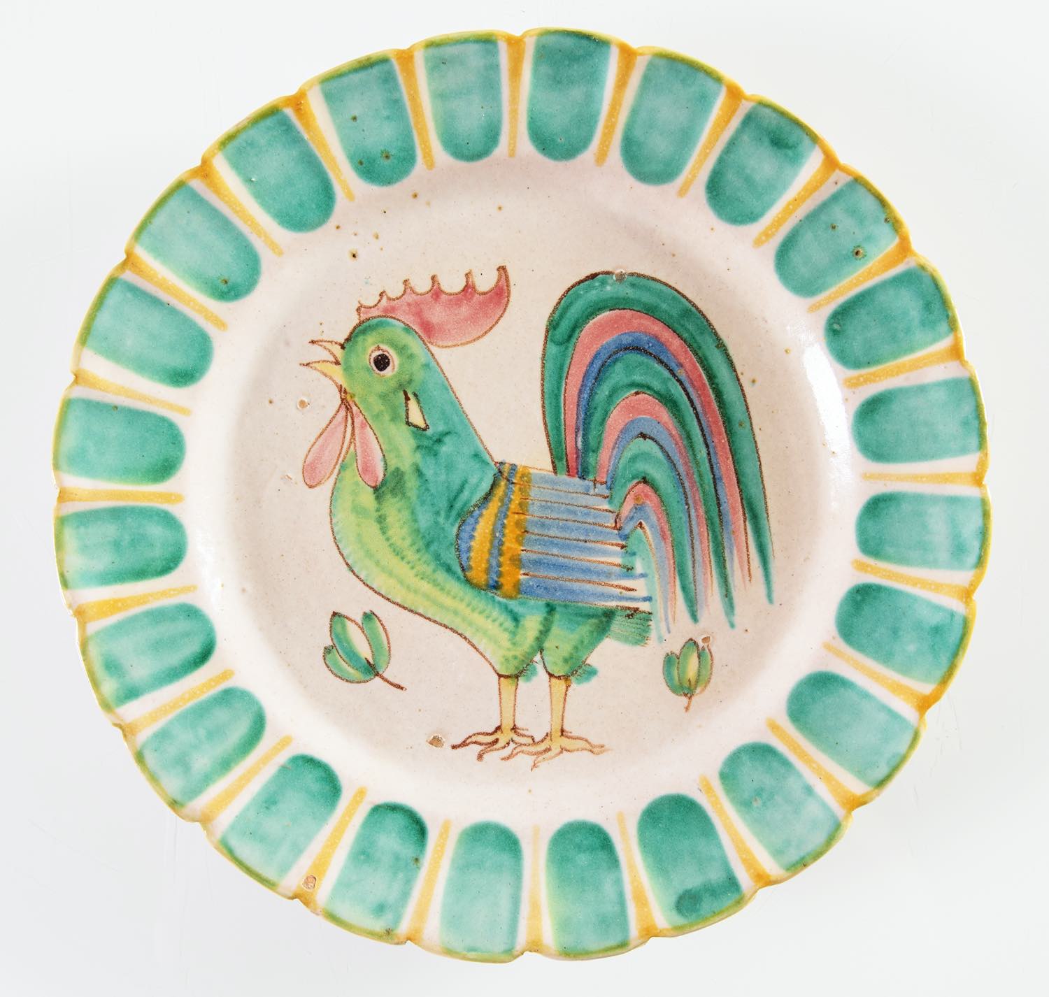 Decorato in policromia con figura di Gallo nel cavetto, bordo polilobato, reca al retro marchio della manifattura e numeri, diametro cm 34 (usure)