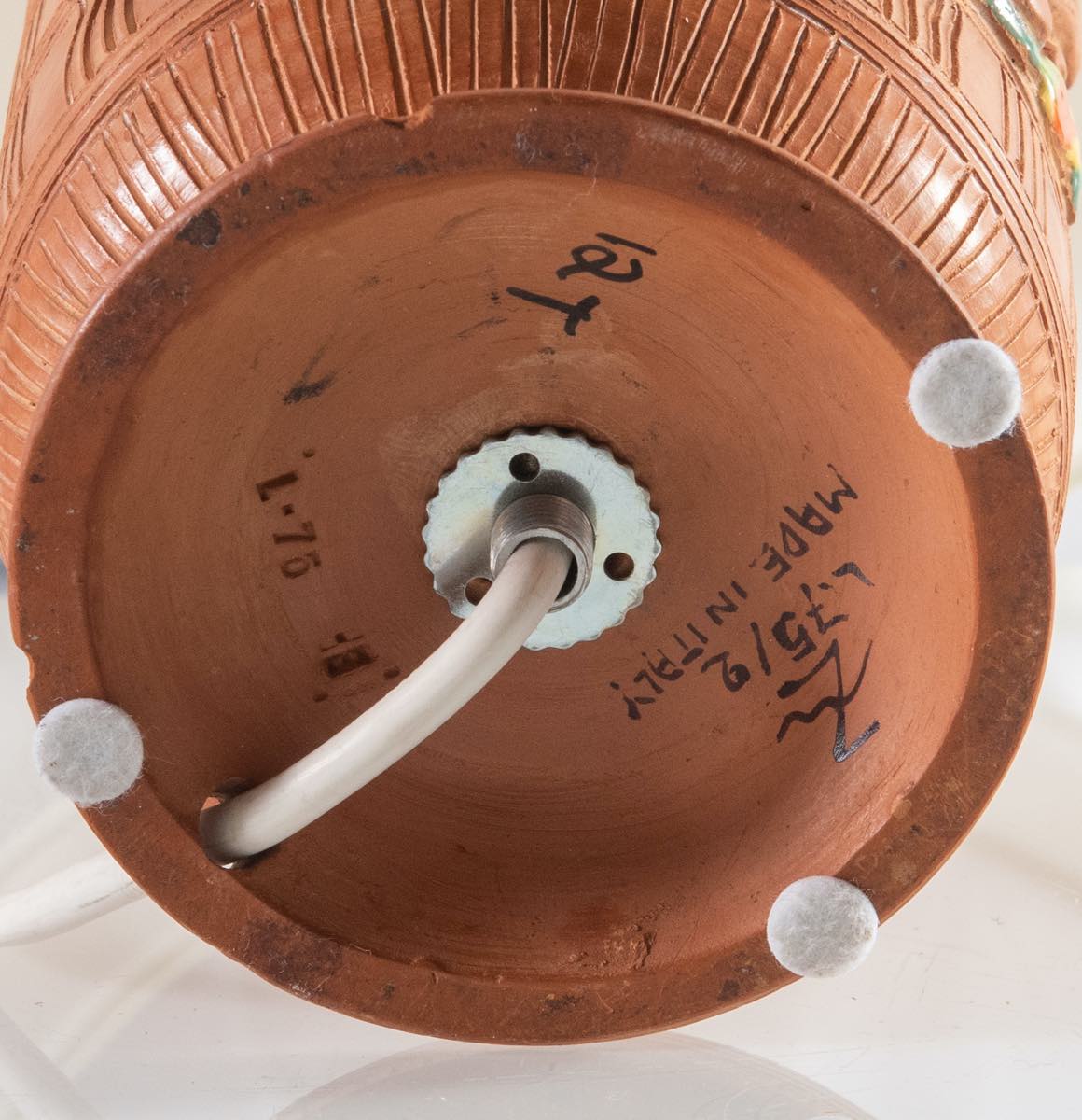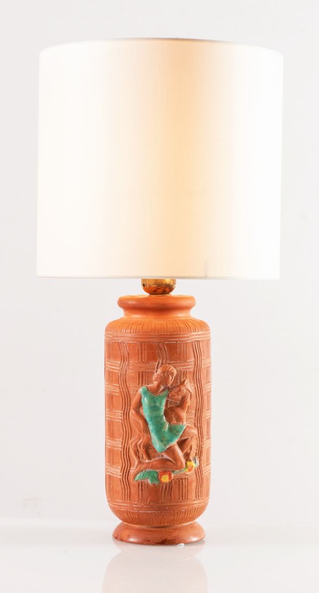 Fusto cilindrico decorato da figura femminile con cerbiatto in policromia a rilievo e motivo geometrico inciso, reca sotto la base marchio della manifattura e iscrizione “L 75/2/made in Italy/12T”, completa di paralume in tessuto, H con paralume cm 50.5 – diametro paralume cm 27 (lievi difetti)