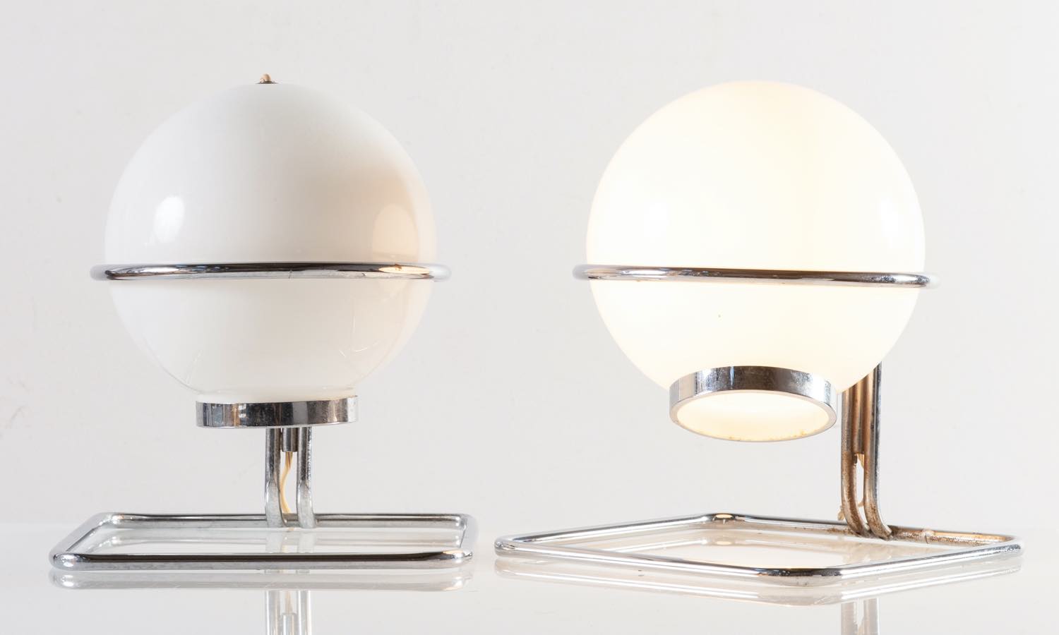 Diffusore sferico in vetro opalino bianco, struttura a sezione quadrata in metallo cromato, H cm 28x24x24