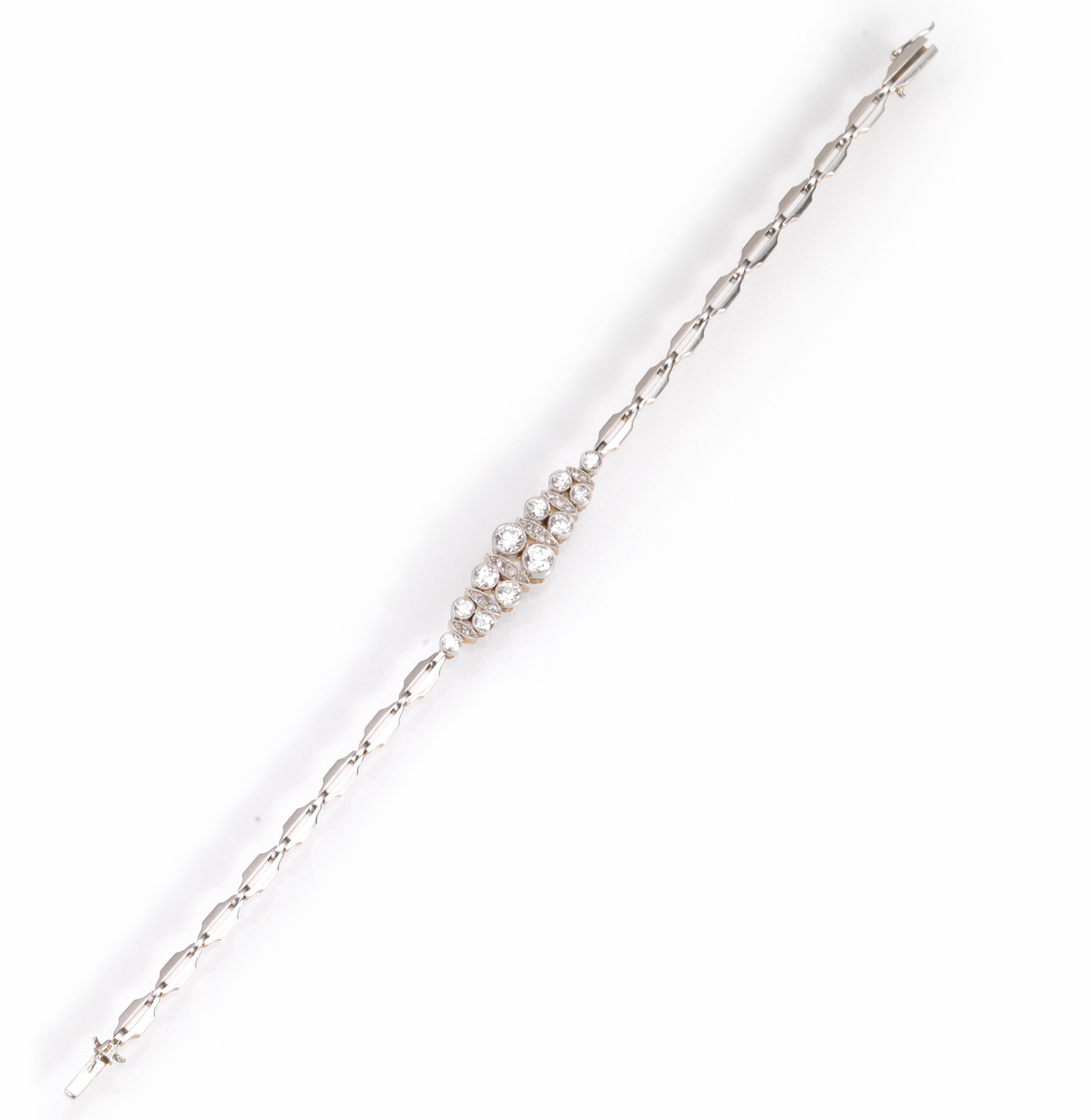 realizzato ad una fila di maglie allungate, al centro un motivo a due file di brillanti taglio vecchio posti in gradazione, g 14