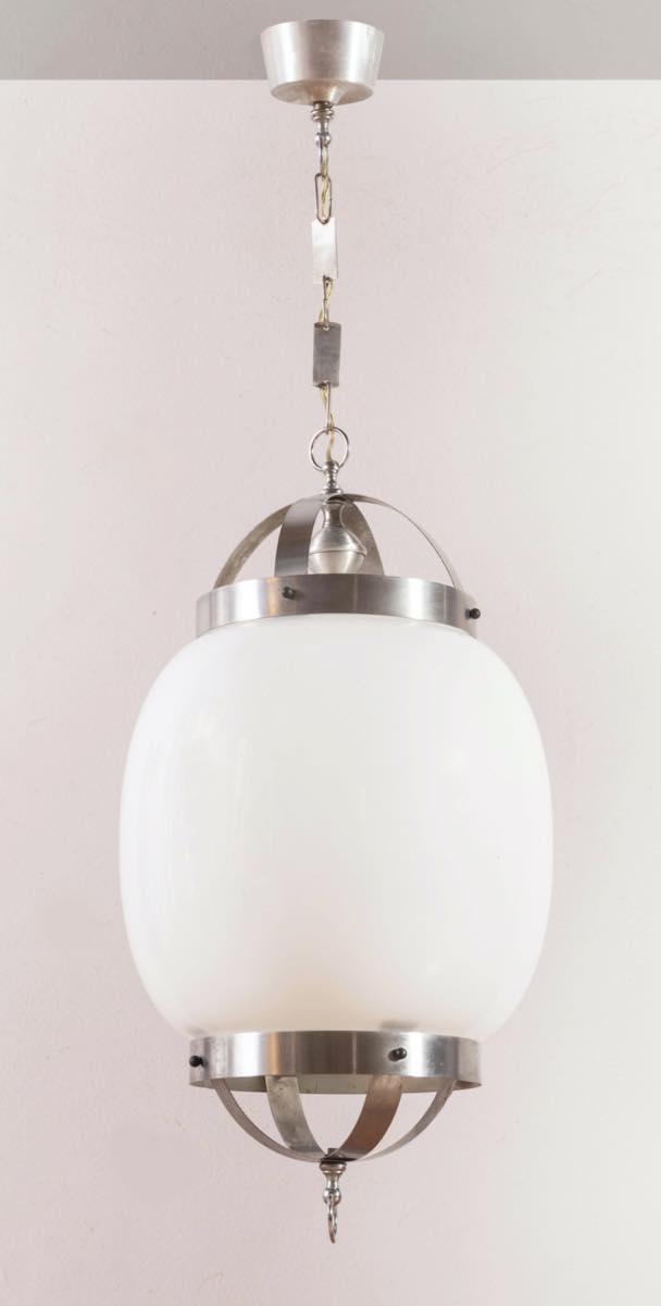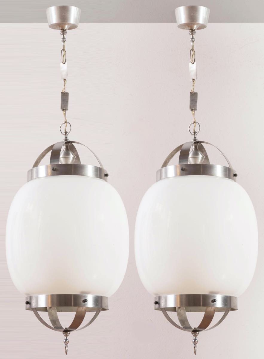Coppia di lampadari in vetro opalino bianco, Italia, Anni ‘70.