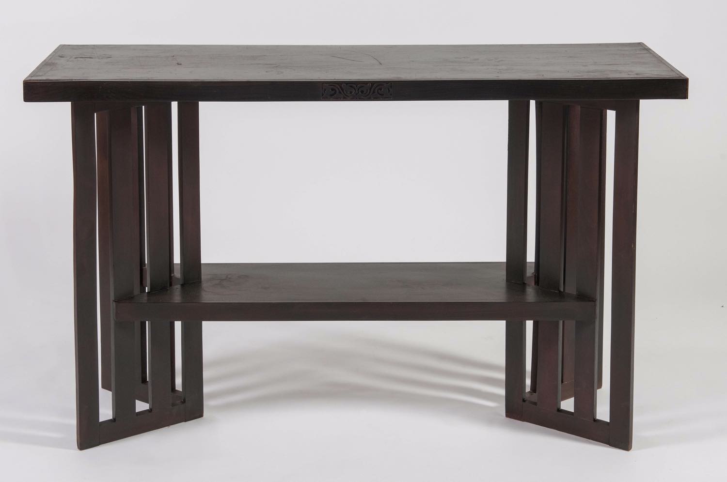 Presenta due ripiani e fregio centrale da ambo i lati, poggiante su sostegni a fasce, H cm 89x140x40.5