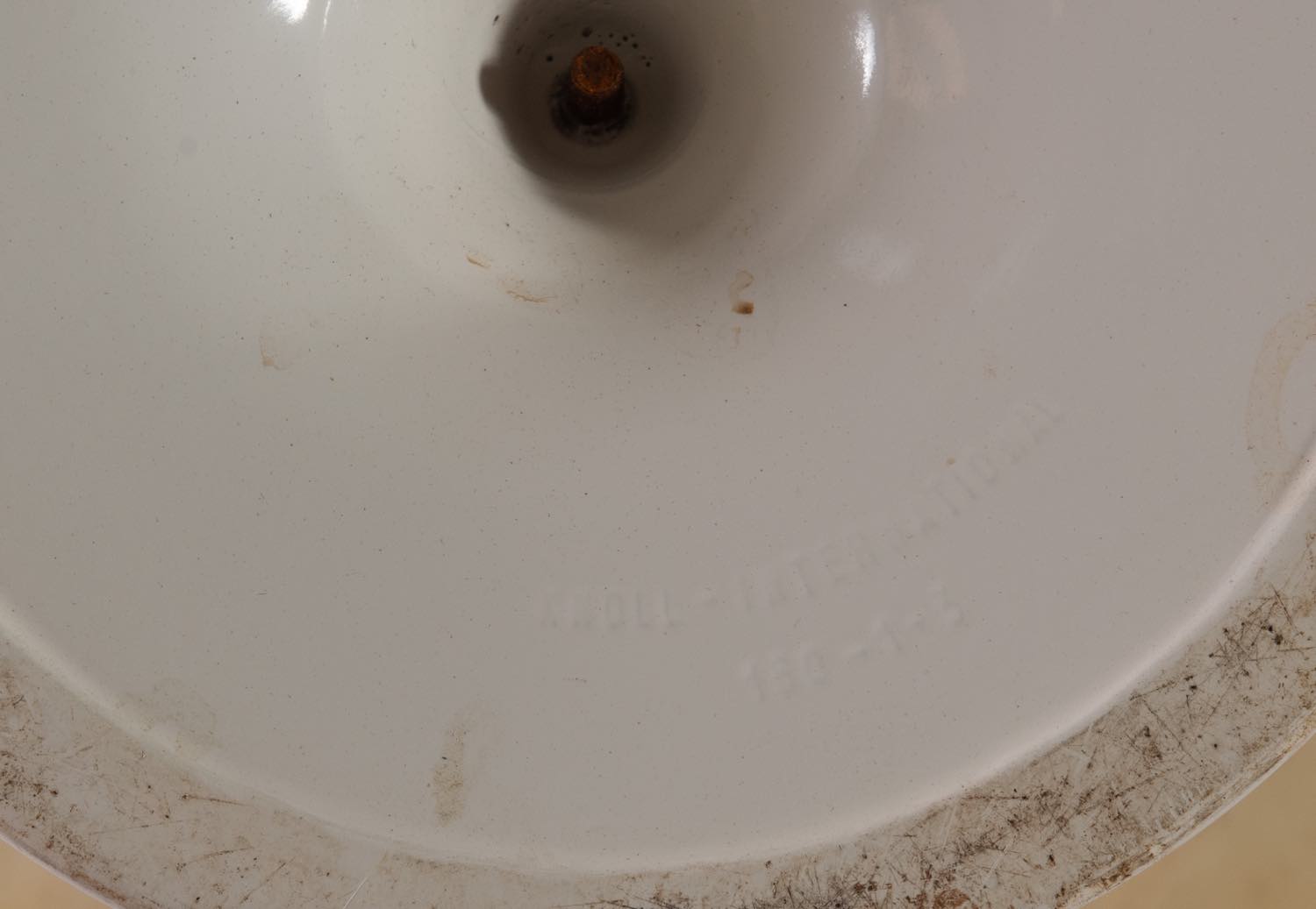 Struttura in metallo laccato bianco, piano in marmo bianco, reca alla base marchio della manifattura impresso, H cm 41 – diametro cm 51 (lievi usure)