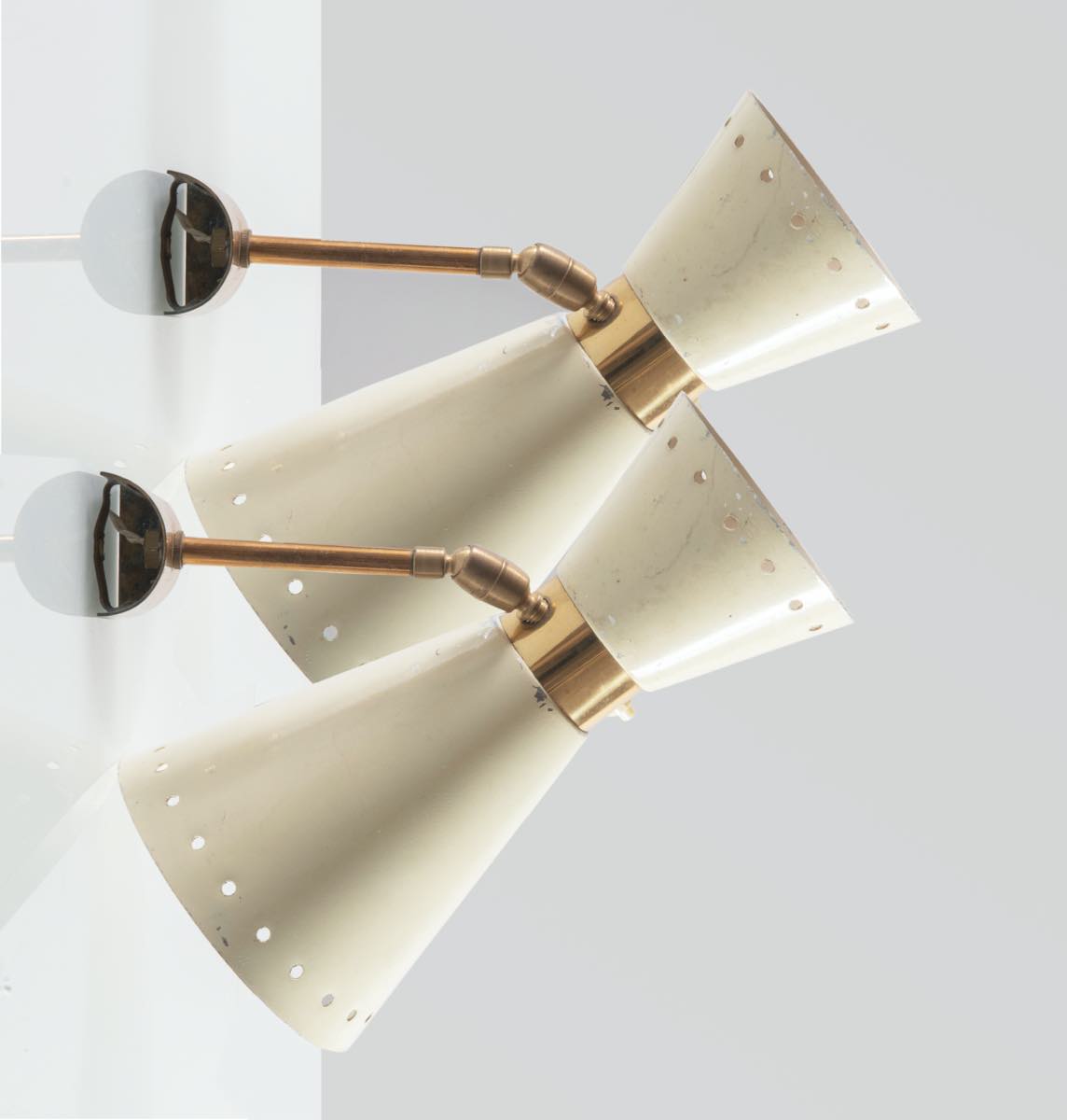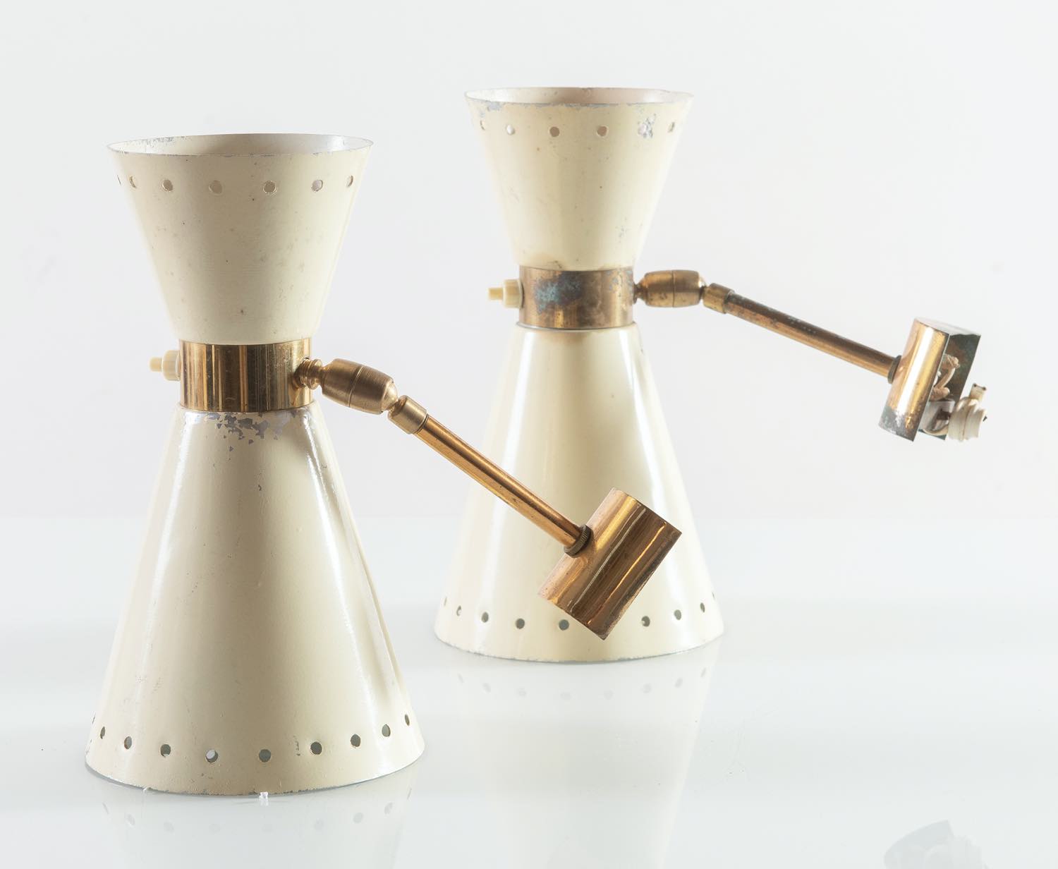 Diffusori bi-conici in metallo laccato bianco, struttura orientabile in ottone dorato, H cm 23.5x25 (lievi usure alla laccatura del metallo – difetti – ossidazioni dell’ottone)