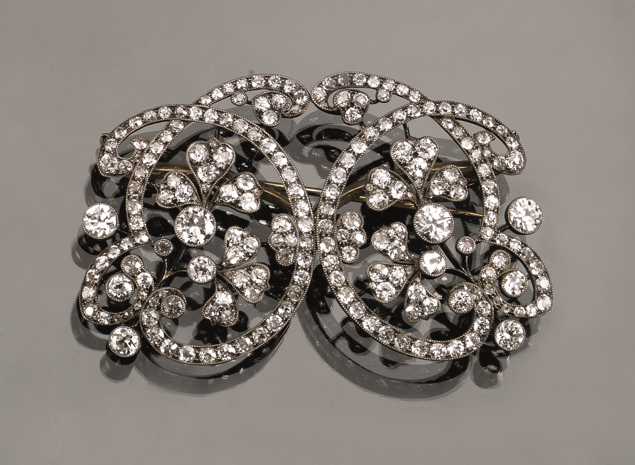 traforata a volute vegetali e floreali, decorate in brillanti di taglio vecchio, tra cui due brillanti da ct 0,60 circa e due da ct 0,90 circa, g 21