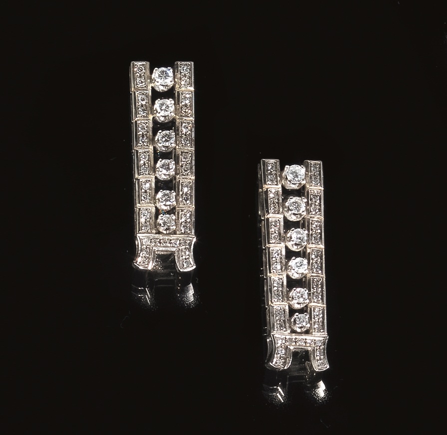 Coppia di clips in oro bianco e diamantidi forma geometrica a 'binario'...