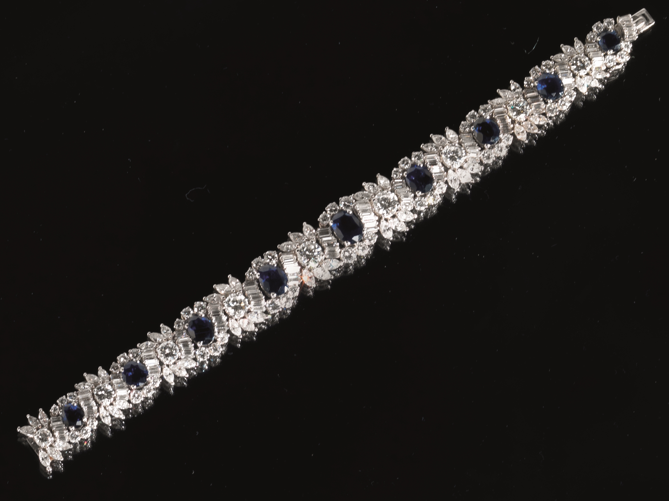 disegnato come una linea di maglie a corolle stilizzate decorate in diamanti di taglio brillante, marquise e baguette, centrate in alternanza da zaffiri ovali e brillanti per ct 4 circa posti in gradazione, g 45