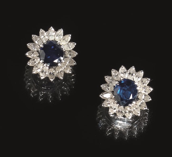 ciascuno realizzato con uno zaffiro ovale di ct 2 circa montato a griffe entro una cornice di brillanti navette, g 7