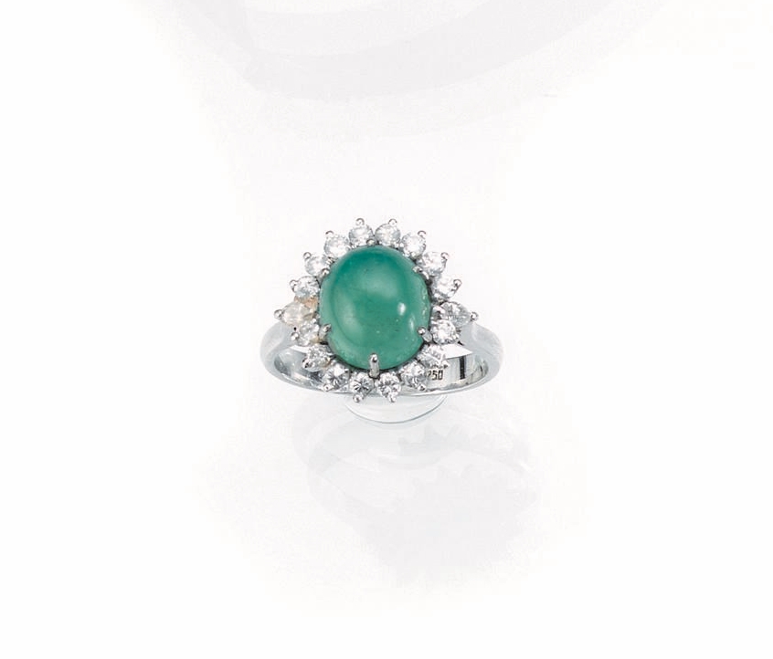 Anello in oro bianco, smeraldo e diamantial centro uno smeraldo cabochon...