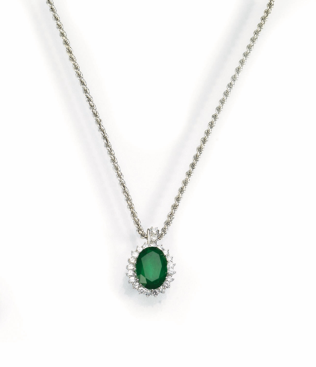 realizzato con una doppietta ovale montata entro cornice ad una fila di brillanti, completo di catena in oro bianco lavorata a torchon, g 20