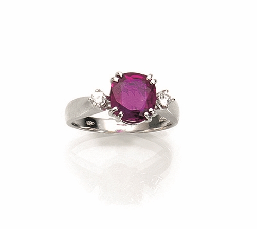 al centro un rubino di forma cuscino, taglio misto di ct 1,27 affiancato da due linee di tre brillanti ciascuna, g 3. Corredato di Certificato Gemmologico I.G.N. n. 16380 datato 11/2/2013