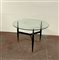 Tavolino da salotto con struttura in metallo verniciato nero, piedini in ottone, piano tondo in vetro. Italia, anni '70. (h cm 44; d cm 65) (lievi difetti e piccole mancanze)