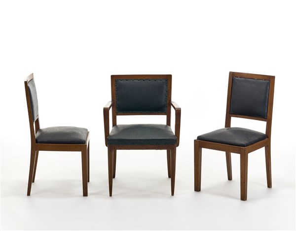 Coppia di sedie e una poltrona con struttura in legno, seduta e schienale imbottiti e rivestiti in similpelle verde. Italia, anni '40.(sedie cm 46x87.5x43: poltrona cm 58.5x86x51) (difetti)