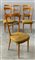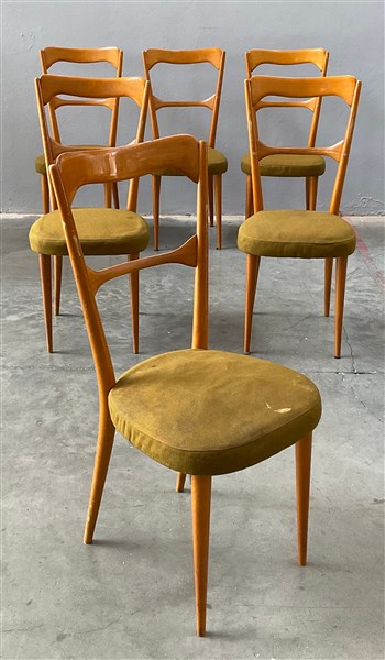 Sei sedie con struttura in legno massello, schienale a giorno e seduta imbottita e rivestita in tessuto verde. Italia, anni '50. (cm 43x94x50) (difetti)