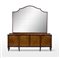 Credenza Barocchetto in legno massello, bordato e impiallacciato di forma sagomata a quattro ante con specchiature in radica e maniglie in metallo e legno tornito; alzata con grande specchiera con cornice in legno a profilo mistilineo. Italia, anni '30. (cm 264x274x52) (difetti)