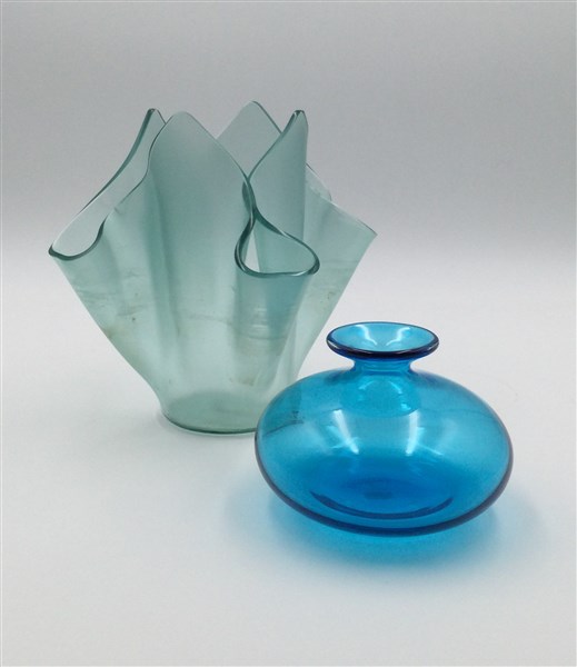 Lotto composto da un vaso a fazzoletto in vetro azzurro acidato sulla superficie esterna, firmato alla base "Berlini" unito a un vasetto in vetro trasparente incolore blu firmato e datato sotto la base. Italia, secolo XX. (h max cm 20) (lievi difetti)