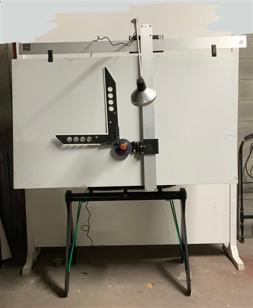 Tavolo con tecnigrafo. Produzione Heron Parigi, 1975. Legno, acciaio e plastica. Recante etichetta adesiva della produzione. (cm 170x196) (lievi difetti)