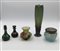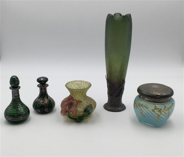 Lotto composto da un vaso in vetro verde fortemente iridato con ghiera in metallo a foggia di fiori e foglie, due bottigliette con tappo in vetro verde con decoro in argento, un vasetto in vetro iridato decorato a rilievo con un fiore e foglia e un vasetto in vetro trasparente azzurro iridato decorato a mano con tappo in metallo. Secolo XX. (misure diverse) (difetti)