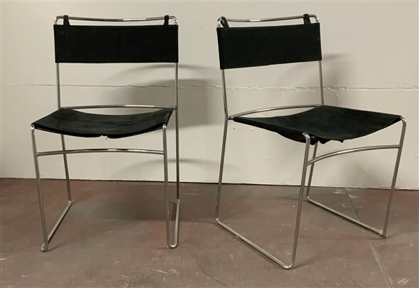 Coppia di sedie modello "Delfina". Produzione Driade, Italia, 1979. Tondino in acciaio, seduta e schienale in tessuto nero. (cm 48x78x58) (lievi difetti)