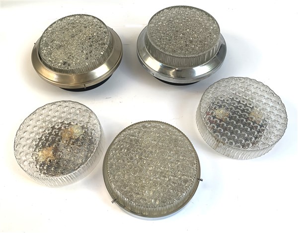 Lotto composto da cinque lampade da parete con struttura in metallo e diffusori in vetro stampato trasparente incolore di forme, dimensioni ed epoche differenti. (lievi difetti)