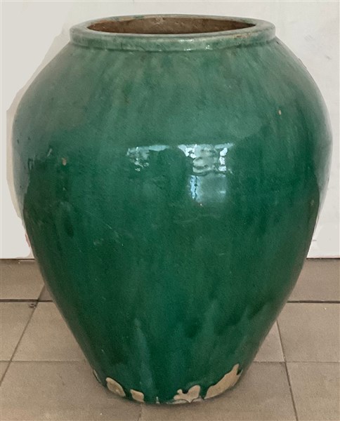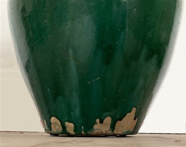 Vaso in terracotta smaltata a colaggio nei toni del verde. Italia, secolo XX. (h cm 48) (lievi difetti)