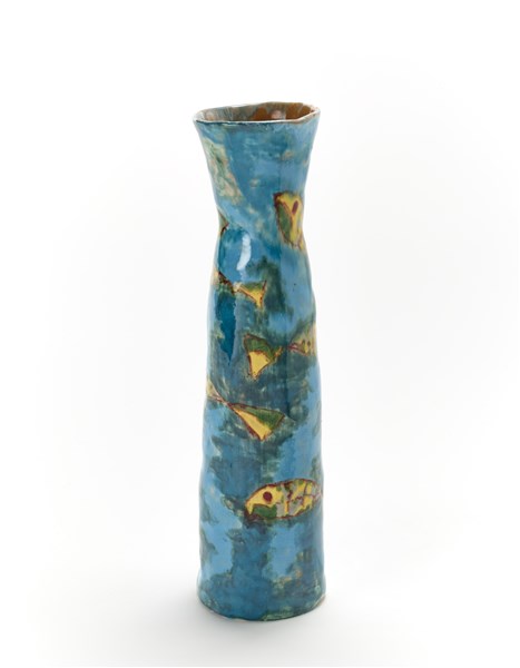 Vaso in ceramica smaltata decorato con pesci gialli, verdi e grigi su fondo celeste/azzurro. Italia, 1958. Firmato sotto la base. (h cm 41)