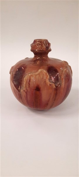 Vaso bulbiforme a collo stretto in maiolica smaltata a colature rosa, beige e a lustri metallici sottovetrina. Francia, prima metà secolo XX. Firmato e numerato a incussione sotto la base. (h cm 20) (lievi difetti)