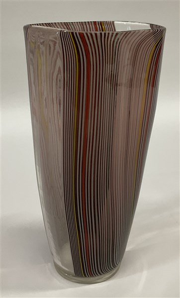 Vaso in vetro trasparente incolore a canne verticali lattimo, ametista, giallo e rosso. Murano, 1985. Firmato e datato a punta sotto la base. (h cm 26) (difetti)