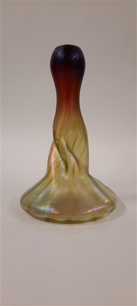 Vaso bulbiforme ritorto in vetro soffiato incolore con superficie incisa e iridescente nei toni dal verde al vinaccia. 1910ca. (h cm 27) (lievi difetti)