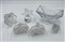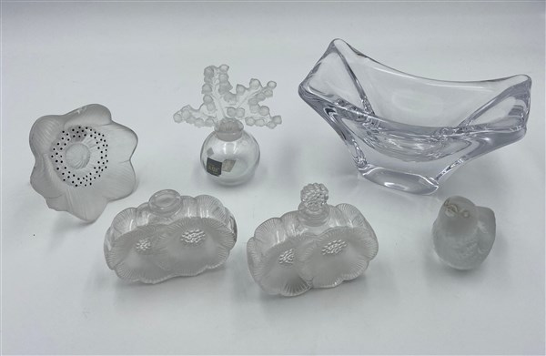 Lotto composto da una sculturina tutto tondo raffigurante un pulcino, un fiore e tre boccette porta profumo in vetro soffiato in stampo e parzialmente acidato della manifattura Lalique, Francia, firmate a punta all'acido sotto la base, uniti a un centro tavola in vetro trasparente incolore della manifattura Daum, Francia, firmato a punta alla base. (misure diverse) (difetti e mancanze)