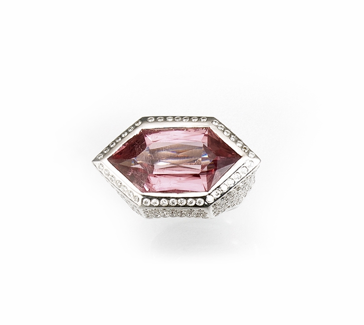 montatura a fascia squadrata decorata in brillanti per ct. 3 circa, al centro una tormalina