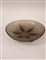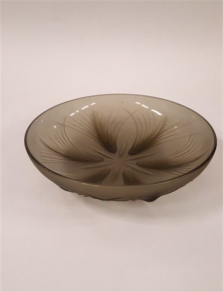 Centrotavola in vetro soffiato in stampo fumé decorato con palme. Francia, prima metà secolo XX. Firmato a punta. (h cm 8; d cm 30) (lievi difetti)