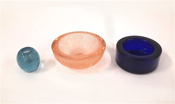 Lotto composto da due oggetti in vetro di Murano a bollicine uniti a un posacenere in vetro trasparente blu scuro. Seconda metà secolo XX. (misure diverse)